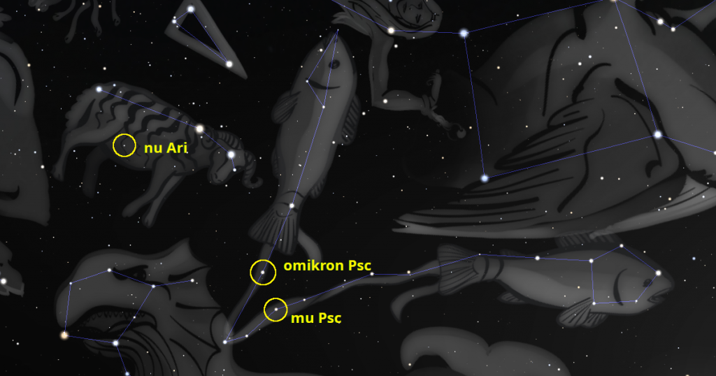 - Február 8-án és 9-én a 4,3 magnitúdós omikron Pisciumot közelíti meg, ami már a csillagkép felső (északi) ágában van.