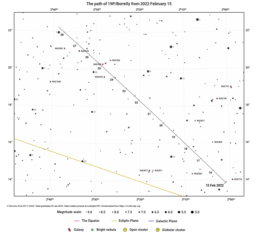Február során egy ismert üstökös, a 19P/Borrelly ér napközelbe, és hétéves periódusú keringése során a legjobban megfigyelhetővé válik ebben a hónapban.
