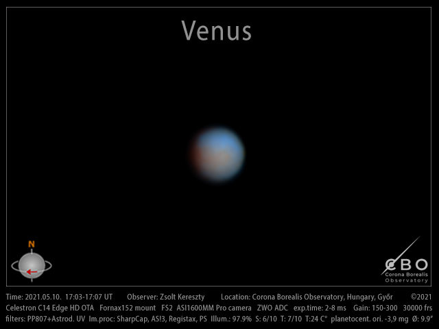 A Vénusz felhősávjai ilyen távolságban nem adják könnyen magukat, ehhez javasolt legalább egy erős (ND1,8-ND3) neutrál szűrőt, vagy egy mélyibolya szűrő segítségét igénybe venni. A horizonthoz közeli páros szivárványos képén atmoszférikus diszperzió korrektorral (vagy legalább egy mélynarancs szűrővel) könnyen segíthetünk.