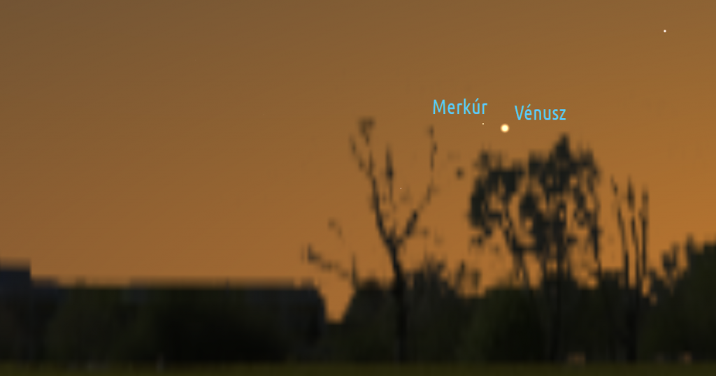 Ritka és szép együttállásra számíthatunk a Naprendszerünk két belső bolygójától, a Merkúrtól és a Vénusztól: 2021.05.28-án, pénteken a szürkület pírjában fél fokra, tehát éppen a telihold átmérőjének távolságára közelítik meg egymást. Kihívás lesz őket megpillantani a lenyugvó Nap derengésében, de mindenképpen megéri a látvány.