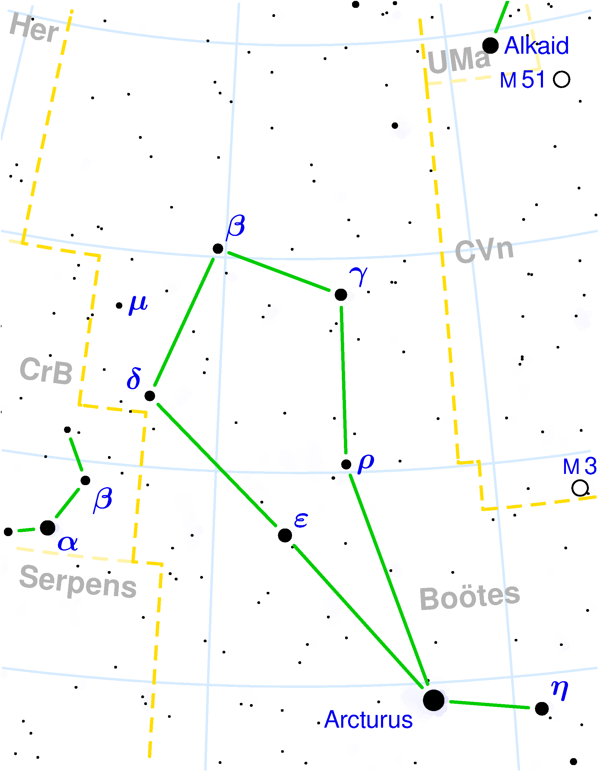 - 44 Bootis: a fedési kettősök közé tartozó változócsillag, 42 fényévre a Földtől. Átlagos fényessége 4.8 magnitúdó, szabad szemmel sárgás színben jelenik meg.