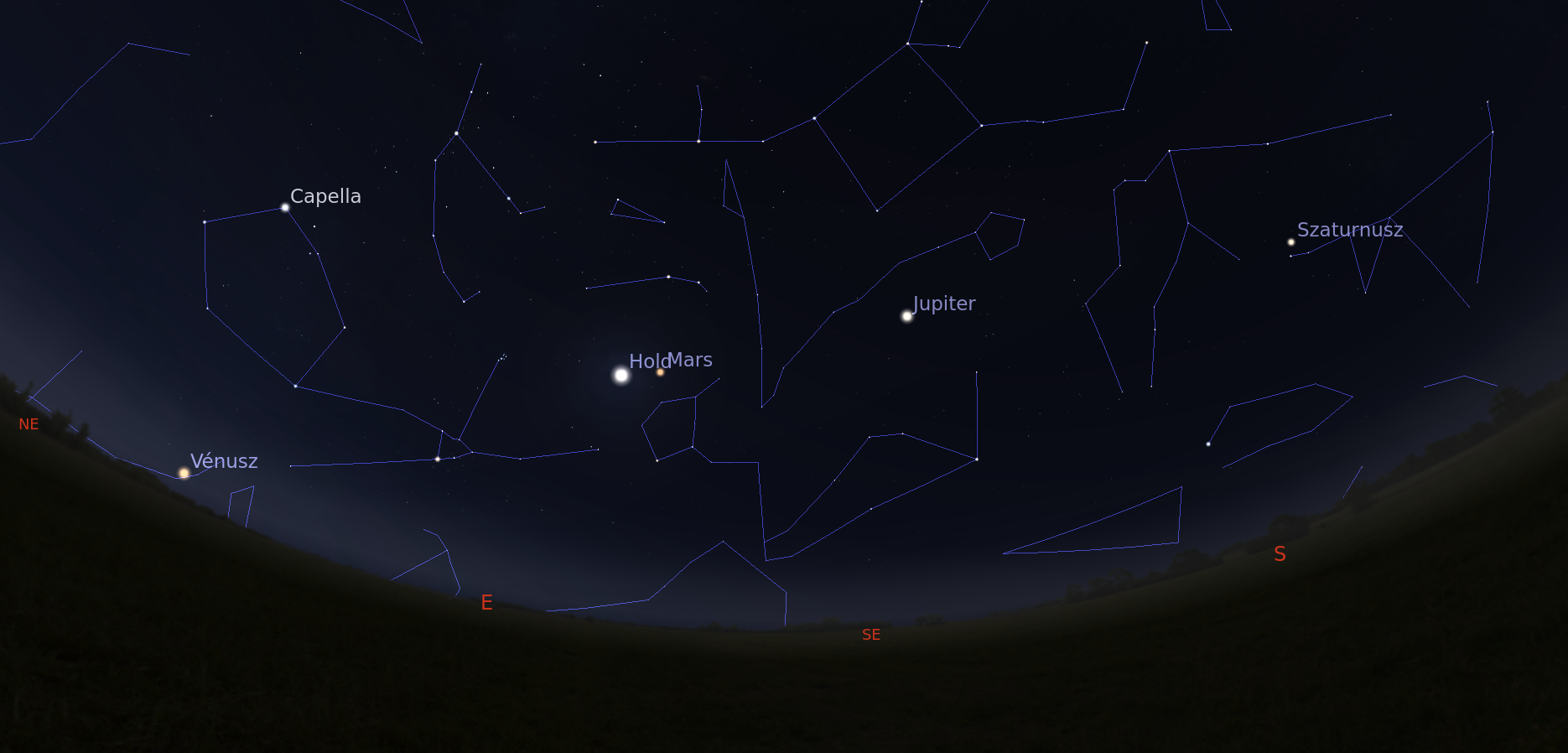 Az viszont ennél jóval látványosabb, hogy még mindig szépen a Mars után sorakoznak a gázbolygók – tehát a Hold és Mars szoros párosa után a Jupiter, majd a Szaturnusz fog ragyogni a Naprendszer síkját kijelölő égi vonalon. Sőt a két bolygó között a Neptunusz is megbújik, amit az Uránuszhoz hasonlóan csak távcsővel figyelhetünk meg. Ráadásképp hajnali fél 4-kor már a Vénusz is felbukkan északkeleten. Tehát aki esetleg lemaradt volna a júniusi bolygósorakozóról, az a Merkúr kivételével az összes bolygót egyszerre láthatja a napokban, és még csak a Hold látványáról sem kell lemondania!