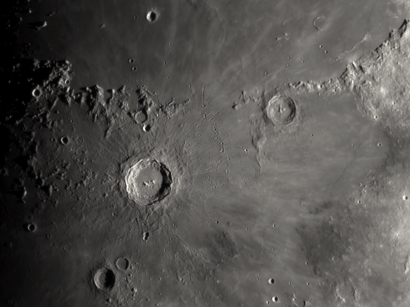 A Plato-krátertől délre, lentebb a terminátor mentén észlelhető égi kísérőnk egyik, ha nem a legszebb krátere, a Copernicus. A nagyjából 1,1 milliárd éves felszíni képződmény szerkezete rendkívül összetett. A kráter közepén több központi csúcsot is észlelhetünk, amelyek magassága közel 1 km. A kráter pereme teraszos szerkezetű ,és körülötte a becsapódás után keletkezett törmeléktakarót és sugársávokat egyaránt jól megfigyelhetjük. A krátertől fentebb, északra helyezkedik el a Kárpátok hegység (Montes Carpatus), amit az árnyékvonal kettévág, így a hegycsúcsai árnyékaiban is gyönyörködhetünk.