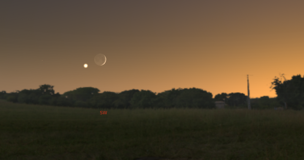 A Vénusz éppen 59%-os megvilágítottságú, ezt azonban csak nagyobb távcsövekkel, legalább kb. 50x-es nagyításon fogjuk megfelelően látni. A Hold ezzel szemben már kézi távcsövekben és szabad szemmel is szépen mutatja majd 14%-os, 3,6 nap idős (tehát 3,6 nappal az újhold utáni), dagadó fázisát.
