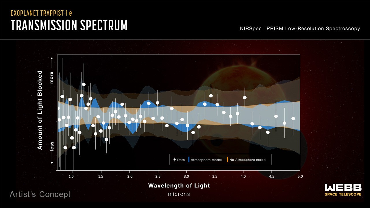 A TRAPPIST-1 rendszerben talált hét, a Földhöz hasonló méretű bolygó közül az e jelű különleges, ugyanis az úgynevezett lakhatósági zónában kering, vagyis egy olyan térrészben, amelyben elméletileg lehetséges, hogy a víz folyékony halmazállapotban van jelen, amennyiben a bolygónak van légköre. A James Webb-űrtávcső NIRSpec nevű közeli infravörös spektrográfjával a kutatók igyekeztek pontos képet alkotni a TRAPPIST-1 e légköréről, és megismerni annak pontos kémiai összetételét.