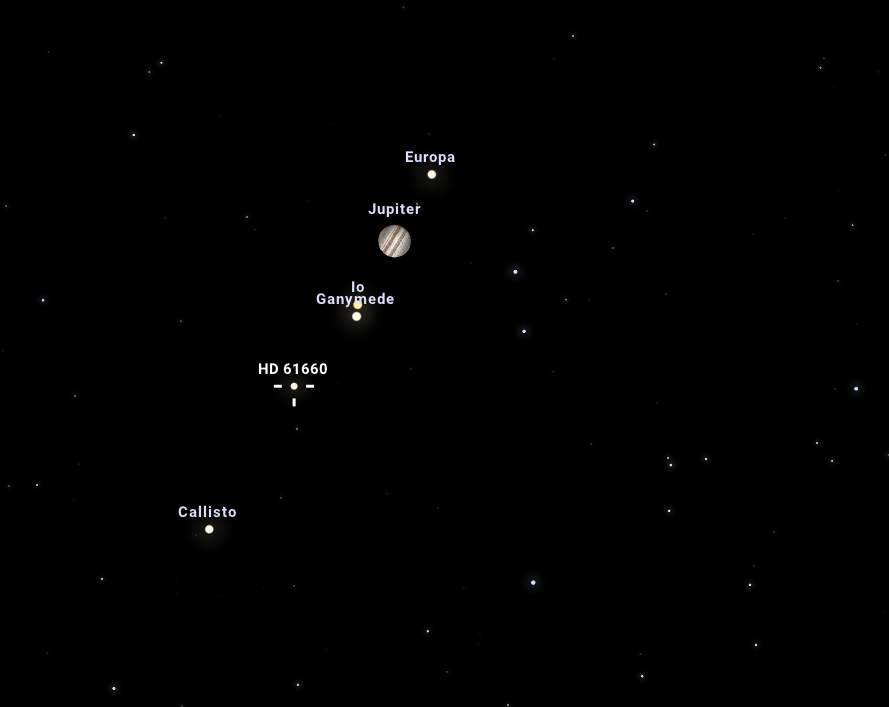 A hónap 12. és 15. napja között ugyanis egy 7,9 magnitúdós csillag, a HD 61660 a Jupiter holdjainak síkjába ér, és távcsővel megfigyelve egy egyenest alkot a jól ismert Galilei-holdakkal, amelyeket Io, Europa, Callisto és Ganymedes néven ismerünk. A bolygók királyát az éjszaka második felében figyelhetjük meg az égen, így ezúttal azok vannak előnyben, akik szeretnek éjszakázni. Ezt a jelenséget ugyanis semmiképpen sem érdemes kihagyni, és tekintve, hogy napokon át is igazán látványos lesz, remélhetőleg még az sem veszi el a lehetőséget az észleléstől, hogy egy-egy éjszaka borult lesz az ég.