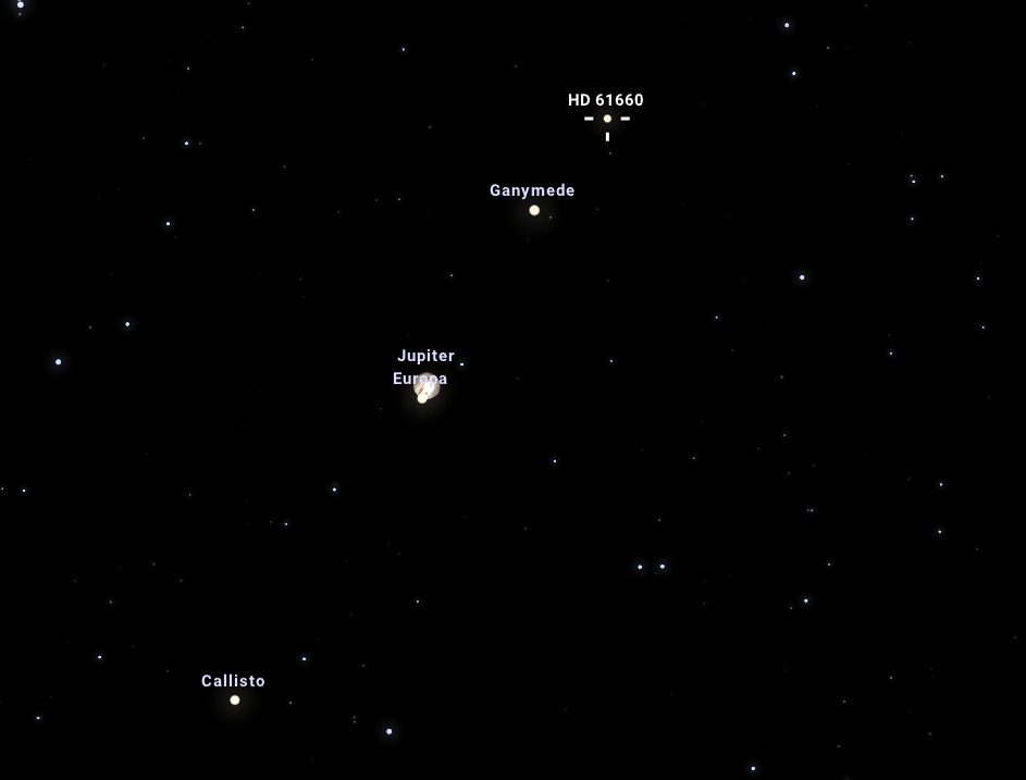 Végül szerda éjszakára a HD 61660 túljut a holdakon, és jobbra felfelé tovább halad az égen. Még ezen a napon is elég közel látszik azonban a Jupiterhez, illetve holdjaihoz, így még utoljára lehetőség kínálkozik a megfigyelésre.