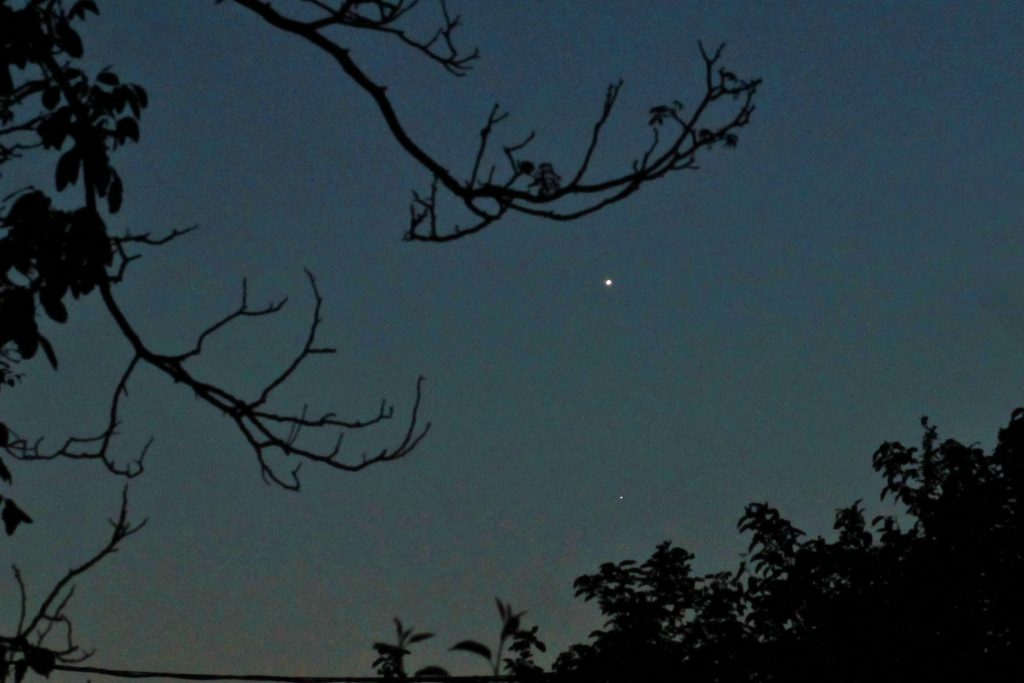 A Merkúr (alul, a fák felett) és Vénusz (felül) együttállása tavaly májusban Szauer Ágoston felvételén. Jól látható a két bolygó látványos fényességkülönbsége.Időpont: 2020.05.21 21:59, Forrás: www.eszlelesek.mcse.hu