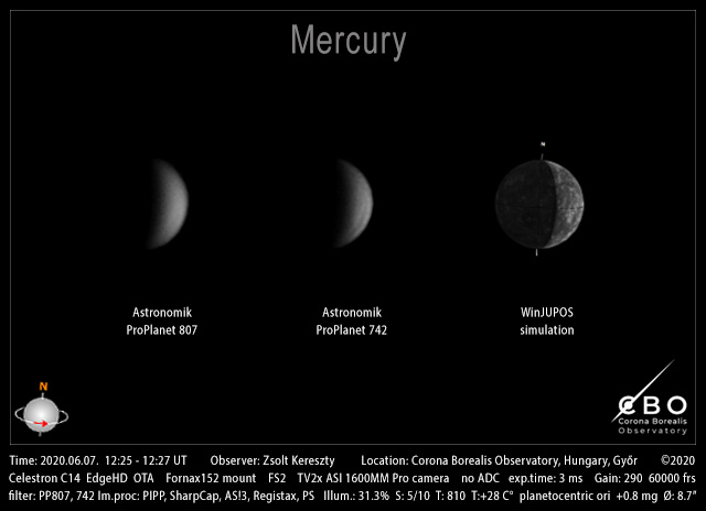 Az utolsó fotografikus Merkúr-észlelés az MCSE adatbázisában. Kereszty Zsolt felvétele, tavaly júniusból, ekkor volt utoljára a bolygónak kellemes láthatósága az esti égbolton. A felvételen egy búcsúzó, keskeny, 30%-os sarlót láthatunk, most majdnem telimerkúrhoz lesz szerencsénk.Forrás: www.eszlelesek.mcse.hu