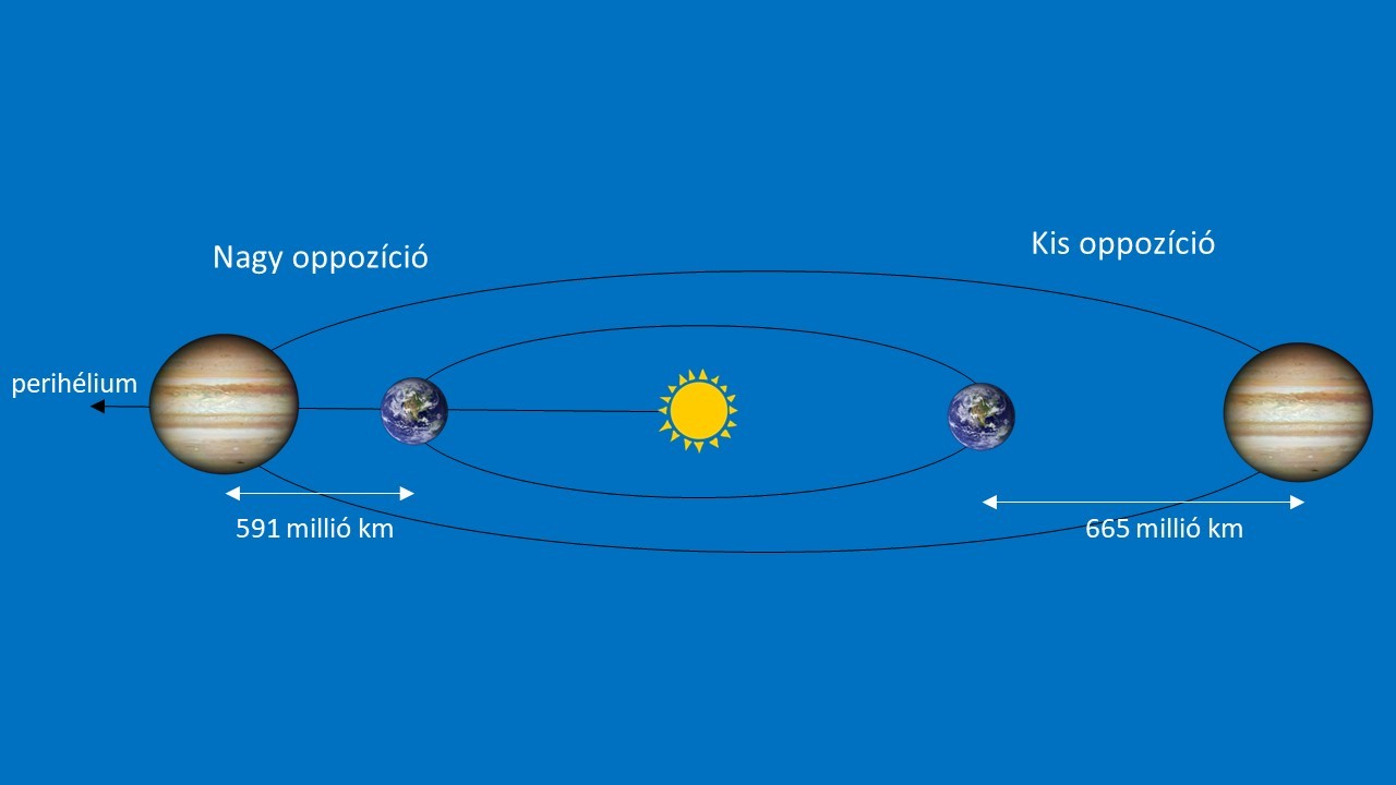 Azonban oppozíció és oppozíció között is van különbség, és ez adja apropóját a mostani különösen fényes Jupiternek. A bolygók a körtől enyhén eltérő ellipszispályán keringenek, így korántsem érdektelen, hogy a szembenállás során a bolygónk napközelben (perihélium) vagy naptávolban (aphélium) jár. Ha napközelben, azaz perihéliumban következik be az oppozíció, a bolygó közelebb lesz a Naphoz, így a Földhöz is, tehát nagyobbnak fog látszani. Ez a hatás is a Marsnál a legerősebb (a bolygók közül a Mars pályája a legelliptikusabb), így vörös bolygónk 18 éves oppozíciós ciklusa közismert, sőt az egyes oppozíciók neveiket is onnan kapják, hogy napközelben vagy naptávolban következnek be. Így szó lehet perihéliumi vagy nagy oppozíciókról, átmeneti oppozíciókról és aphéliumi vagy kis oppozíciókról. A figyelem érthető: perihéliumi nagy oppozícióban a Mars 25”-es átmérőjű lehet, míg egy aphéliumi kis oppozíció során csak 14,5”-es a korongja. Ennek a gyakorlati jelentősége is nagy: Ha űreszközt küldünk a Marsra, nem mindegy, hogy 56 millió vagy 96 millió kilométert kell egy szondának utaznia, az indítási ablakoknál nagyon fontos az oppozíció milyensége.