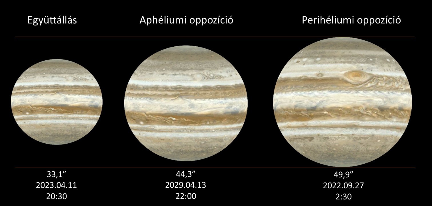 Még drámaibb azonban a különbség, ha a mostani nagy szembenállást hasonlítjuk össze az együttállásával. A nagy szembenállás mellé nagy együttállás társul, így a 2023. április 11-én bekövetkező együttállásakor a bolygó 33,1”-es méretű és -2,1 magnitúdó fényességű lesz, éppen csak kétharmad korongméretű, mint szembenálláskor. Ennél is nagyobb a különbség, ha a legkisebb aphéliumi együttállást nézzük: a Jupiter legkisebb lehetséges mérete 29,8”, fényessége pedig -1,66 magnitúdó. Az aphéliumban együttálló Jupiter alig haladja meg a Sirius fényességét, a perihéliumban szembenálló pedig a nagy oppozícióban levő Marssal megegyező fényű, a felső együttálláshoz közeledő Vénuszt ostromolja.
