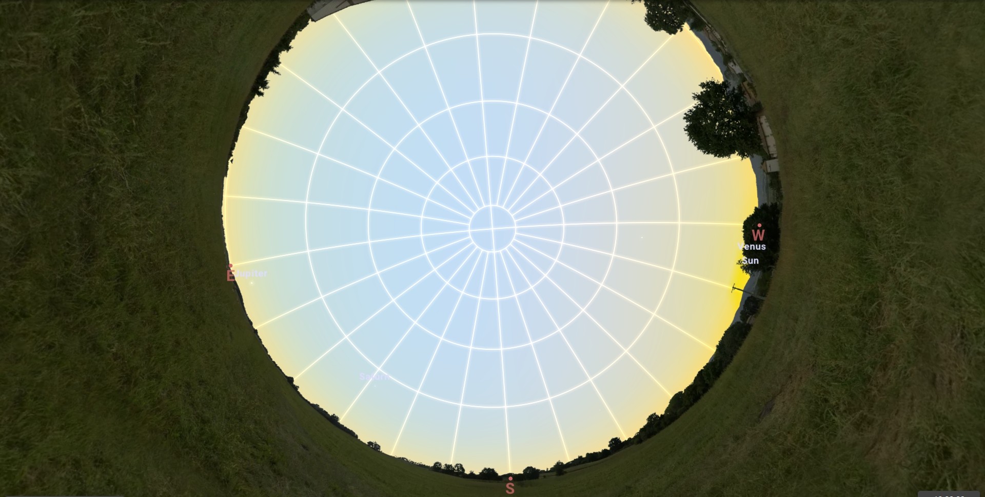 A Jupiter útja az égen, 2022, 2023, 2024, 2025, 2026 és 2027 szeptember 26-án, 5:00 órakor. Jól látható, hogy évről évre halad keletre az ekliptikán, végig az állatövi csillagképeken. Winjupos szimuláció.
