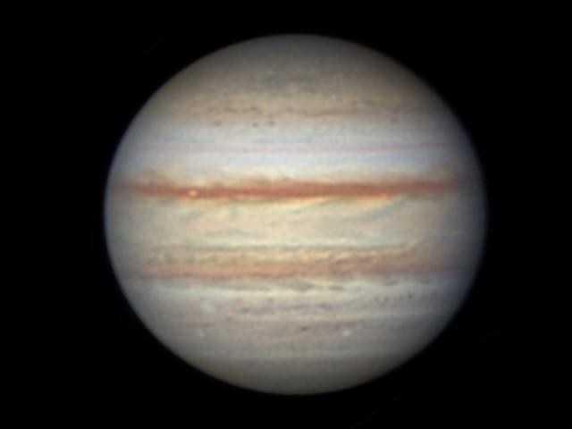 Ha szabad szemmel ennyire izgalmas, távcsővel még sokkal inkább! Nincs olyan kis nagyítású vagy ócska távcső, ami ne bontaná korongjára a Jupitert. Hatalmas élmény már egy kézi binokulárral is gyönyörködni az igézően fényes bolygóban, sőt a körülötte keringő Galilei-holdak is előbukkannak vele. Egy 20x-os nagyítású kis távcső már megmutatja a Jupiter korongjának elliptikus, lapult alakját, és a két egyenlítői sávot is! Egy 7-8 cm-es átmérőjű kis lencsés távcsővel, 100x nagyításon az egyenlítői felhősávok fodrai is elkezdenek látszani, sőt még 1-2 mérsékelt övi sáv is előbukkanhat a bolygón. Egy 10 cm-es távcsővel a Nagy Vörös Folt, ez a jelenleg narancssárga színű óriásciklon is kényelmesen megfigyelhető, ha éppen felénk fordul. Egy 15-20 cm-es jó minőségű távcsőbe nézve pedig füzérek sokasága bukkan fel az Egyenlítői Zónában, kondenzációk és projekciók indulnak az Északi Egyenlítői Sávról, többosztatú a déli Egyenlítői Sáv, és a pólusvidékeken is előjönnek finom inhomogenitások, kondenzációk. A bolygó északi féltekéje jelenleg 2,6°-kal billen felénk, így az északi pólusrégió érezhetően jobban látszik, mint a déli.
