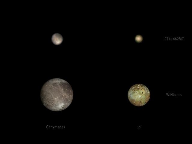 Legalább 10 cm-es távcsővel, legalább 200x nagyításon szemmel látható a holdak közti méret- és színkülönbség: legfényesebb és legnagyobb a sárgásfehér Ganymedes, legsötétebb, szürkés színű, de szintén nagy a Callisto, kicsi, de fényesebb és kifejezetten sárgás az Io, kicsi, halványabb és tiszta fehér az Europa. Nagy, 20-30 cm-es műszerekkel, 500-1000x nagyításon próbálkozzunk felszíni részletek megfigyelésével is! Legkönnyebb a Ganymedes, amelynek nagy barnás ősföldjei és fehér árkolt régiói könnyen megpillanthatók és elkülöníthetők. Második legkönnyebb dolgunk az Ioval van, ami bár picike, de színes, sárga, zöld és barna foltok tarkítják. Nagy kínszenvedés a Callisto észlelése: nemcsak lilásfekete színe kiábrándító, de apró, sugaras krátereiből származó finomskálájú márványossága nagyon nehezen észlelhetővé teszi. Ennél csak az Europa keményebb dió, hiszen nemcsak a legkisebb, de a legegyenletesebb jégfelszínű is. Az űrszondás képek színes lineái a valósághoz képest túlhúzottak, itt legfeljebb csak a legnagyobb, alig eltérő sötét és világos régiókat tudjuk megkülönböztetni. Lenyűgöző érzés azonban, hogy a vállalkozó szellemű bolygóészlelő számára Naprendszerünk 4 új szilárd felszínű „bolygóval” bővül!