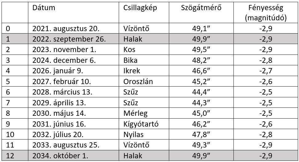 Táblázat: A Jupiter szembenállásai, méret- és fényességváltozása a következő keringési ciklusa során.