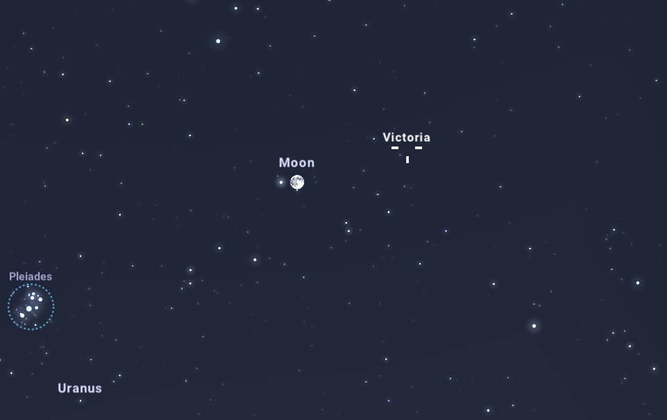 November 5-én a (12) Victoria kisbolygót lehet majd oppozícióban megfigyelni. A legtöbb aszteroida a Mars és a Jupiter közötti fő aszteroidaövben található. Ez a régió a Naprendszer egyik alaposan kutatott területe, mivel sokféle méretű és összetételű égitest kering itt, többek között a Victoria kisbolygó is. Ez az aszteroida egy nagyobb méretű, kőzetes (S-típusú) kisbolygó. John Russell Hind brit csillagász fedezte fel 1850. szeptember 13-án, és a római győzelem istennőjéről, Victoriáról nevezte el. Az égitest átmérője körülbelül 116 kilométer, és mintegy 3,57 év alatt kerüli meg a Napot, miközben saját tengelye körül nagyjából 8,7 óra alatt fordul meg. Pályája enyhén elnyúlt és kis mértékben dől a Naprendszer síkjához. Felszíne főként szilikátos kőzetekből áll, amelyek jó fényvisszaverő képességet adnak neki. Ezen az estén azonban még könnyebben megfigyelhető lesz, ugyanis az oppozíció környékén a kisbolygó látszó fényessége eléri a maximumát, mivel ilyenkor a Nap teljes megvilágítása éri, és a Földhöz viszonyított távolsága is jellemzően ekkor a legkisebb pályája mentén. Ez az állapot általában kedvező a megfigyelés szempontjából, mivel az égitest nemcsak fényesebbnek látszik, hanem hosszabb ideig is látható az éjszakai égbolton. A Victoria kisbolygó pedig most egészen 9,8 magnitúdóig fényesedik a Kos csillagképben, de a közelében tartózkodó telehold biztosan megnehezíti a megfigyelését. Úgyhogy kapjunk is elő egy távcsövet, és irány az éjszakai égbolt!