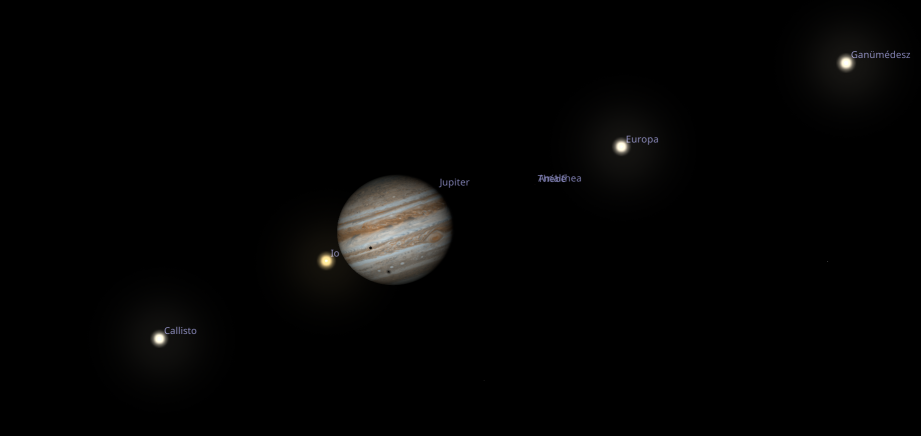 Az ezután következő jelenségre szerencsére nem kell sokat várni, ugyanis már ugyanezen a napon, november 21-én egy másik látványos észlelési lehetőség is tárulkozik az égboltot kémlelők elé. A Jupiter megfigyelőire vár majd egy különleges látvány, kettős árnyékvetés zajlik a bolygó felhőzetén, miközben a Nagy Vörös Folt is látható lesz, igazi kozmikus hármas esemény! 3:15 körül a Jupiteren egyszerre lesz megfigyelhető Io és Callisto árnyéka, amint sötét pontként vetülnek a bolygó világos felhőzeteire. Az esemény különlegessége, hogy Callisto ritkán vet árnyékot a Jupiterre, mivel pályája kissé a bolygó egyenlítői síkja fölött és alatt halad, így a mostani kettős árnyékvetés a megfigyelők számára igazi ritkaságszámba megy. Mindeközben a Jupiter Nagy Vörös Foltja, a bolygó ikonikus, hatalmas viharzónája is jól látható lesz a középső déli sávban. A látvány tehát egyszerre három elemet kínál: két „gyorsan” mozgó, fekete árnyékpontot és a hatalmas, vöröses-narancsos, „lassabban” mozgó örvényt. Az esemény idején a Jupiter 64° magasan lesz, így a megfigyelési körülmények kiválóak a hajnali égbolton. Már egy 10–15 cm-es távcsővel is látványosan követhető mindkét árnyék mozgása, amelyek lassan, percek alatt észrevehetően vándorolnak a Jupiter korongján.