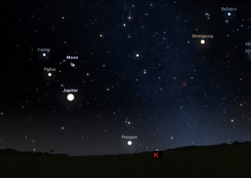 Ezen a napon este 10 órakor ugyanis a Hold megérkezik az Ikrek csillagkép legfényesebb csillagai, a Pollux és a Castor társaságába, s ha mindez még nem lenne elég, negyedikként csatlakozik hozzájuk a bolygók királya, a fényes Jupiter. Az együttállás nem igényel különösebb észlelési tapasztalatot, a Hold megkeresése után csak a hozzá legközelebbi és legfényesebb égitesteket kell észrevenni ahhoz, hogy szép élményhez jussunk.