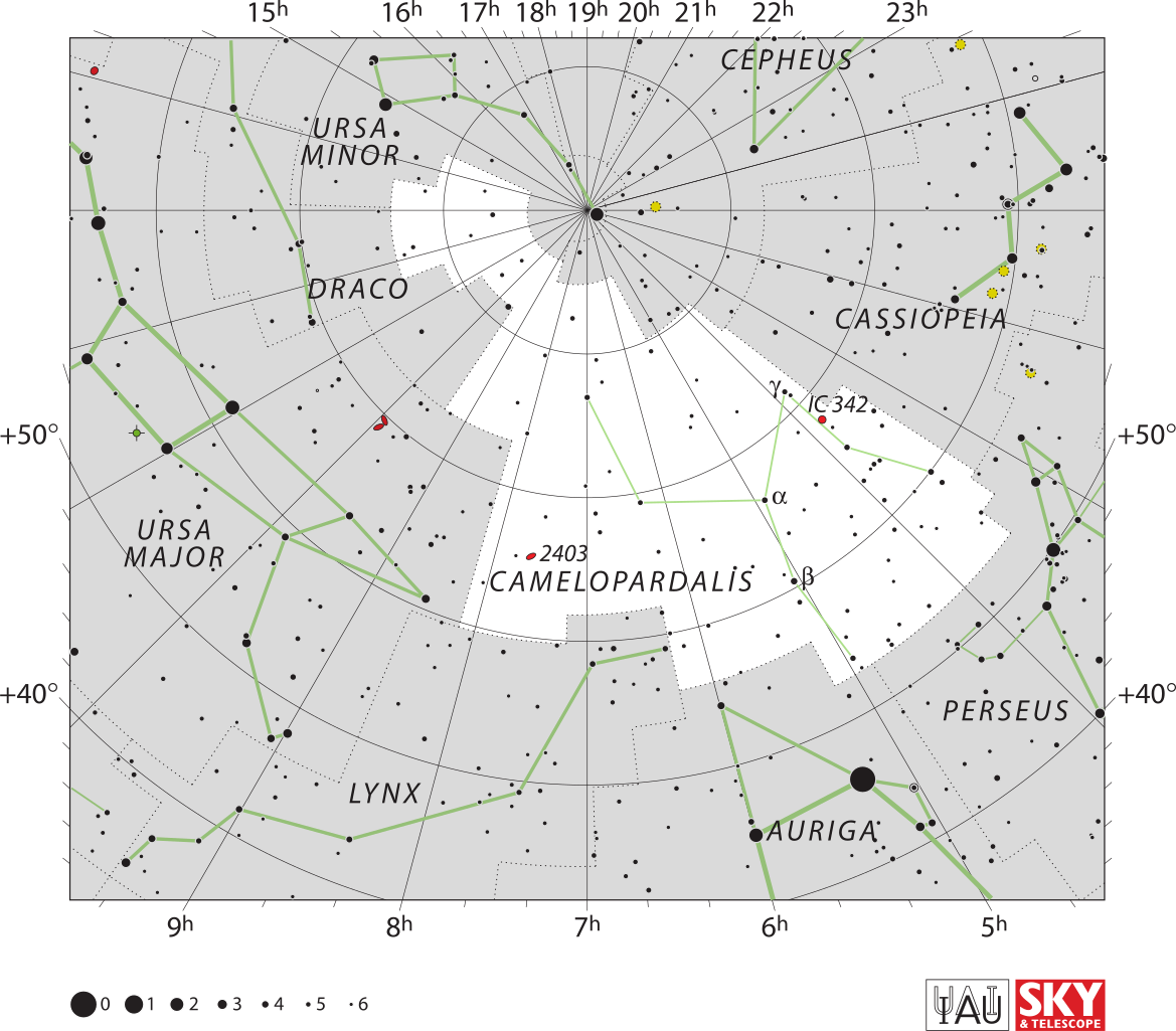 - IC 342 (Caldwell 5): spirálgalaxis, amely fényessége ellenére a porfelhők mögötti elhelyezkedése miatt nehezen megfigyelhető. Ezért kapta a „Rejtett galaxis” nem hivatalos nevet. Binokulárral azonban már megtekinthető. Ha nem takarná el a por, szabad szemmel is látható lenne. A por miatt nehéz meghatározni pontos távolságát: becslések alapján 7-11 millió fényévre lehet tőlünk. Ez az egyik legfényesebb galaxis az IC 342/Maffei-csoportban, amely a Lokális Csoport egyik legközelebbi galaxiscsoportosulása. Edwin Hubble először azt hitte, hogy a Lokális Csoport tagja, de később kiderült, hogy nem tartozik hozzá.