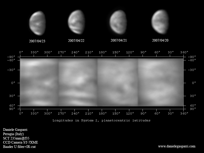 A Vénusz felhőzetéről térképet is készíthetünk! Bár a bolygó forgása csigalassú (243 nap), a felhőtető szerencsénkre 4 nap alatt szuperrotál. A hatalmas szelek ennyi idő alatt körbekergetik a felhőket a bolygó körül. Tehát 70%-os fázisnál a bolygó felhőzetének negyedét jól és viszonylag torzításmentesen lefotózhatjuk.