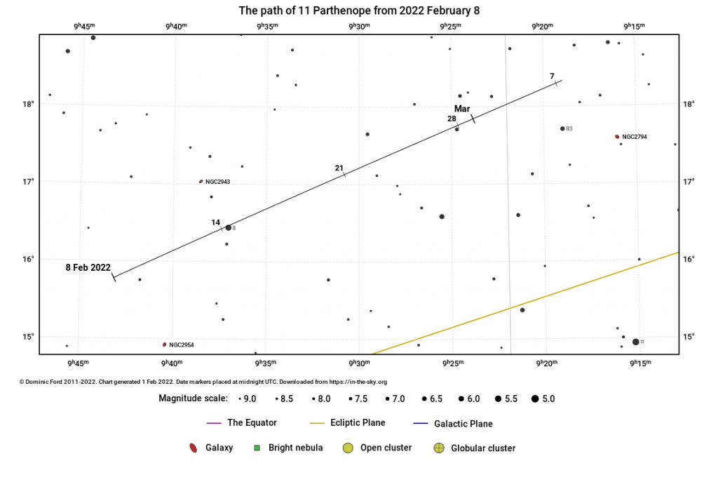A (10) Parthenope kisbolygó is ezen az éjszakán kerül oppozícióba. Oppozíciónak azt nevezzük egy kisbolygó vagy más égitest keringése során, amikor az éppen a Nappal átellenes oldalára ér a Földnek.