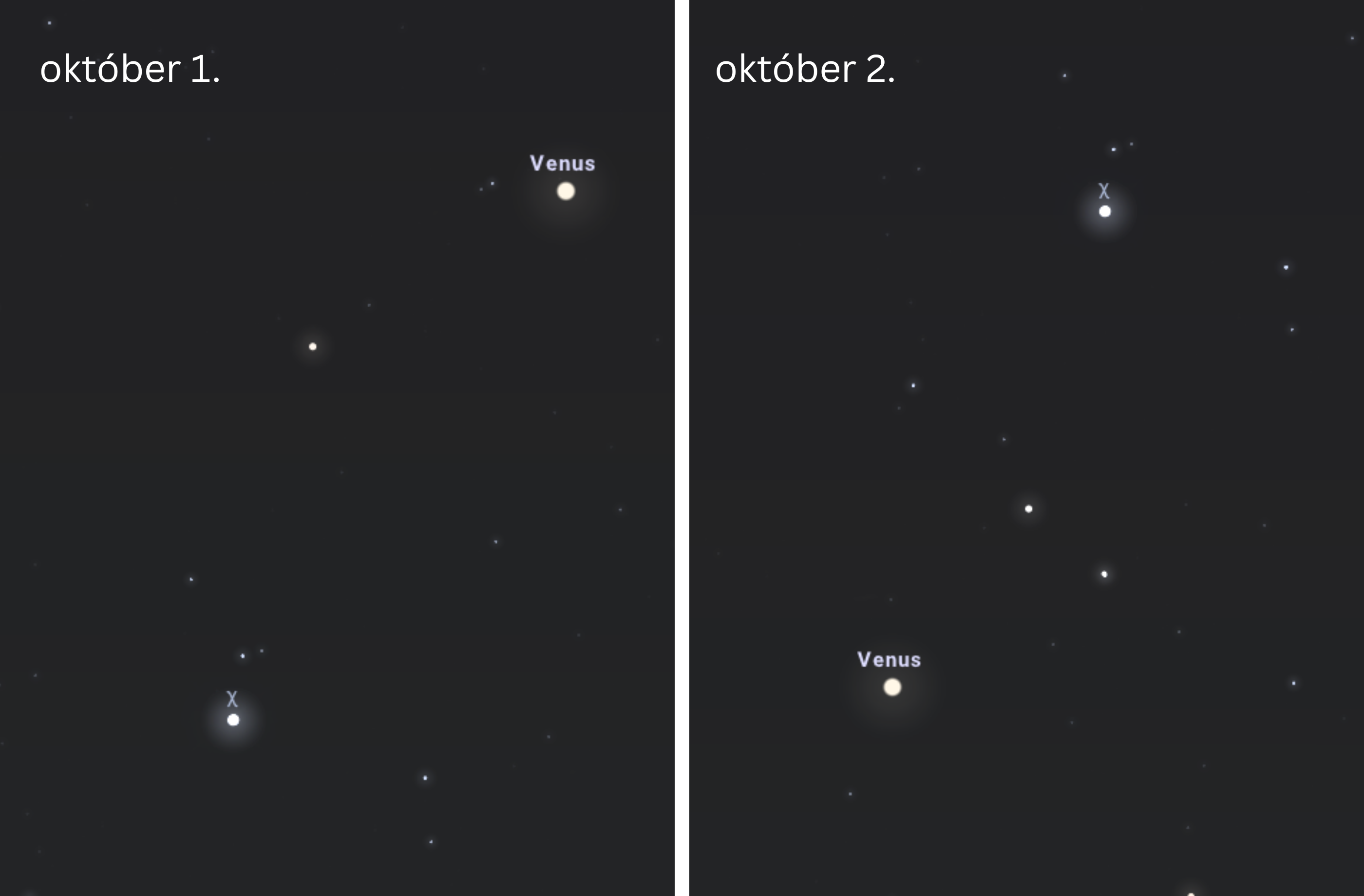 Azonban 2025. október 12-én a Vénusz – bár nem takarja ki a csillagot, de – nagyon közel látszik hozzá. A csillag és a bolygó közti szögtávolság 51’ lesz, így egy közepes távcső vagy kézi látcső látómezejébe könnyedén belefér a páros. A jelenség szintén a keleti láthatár fölött lesz látható, csakúgy, mint a korábban említettek. 5:45-kor egymás mellett lesznek az égen 7° magasan.