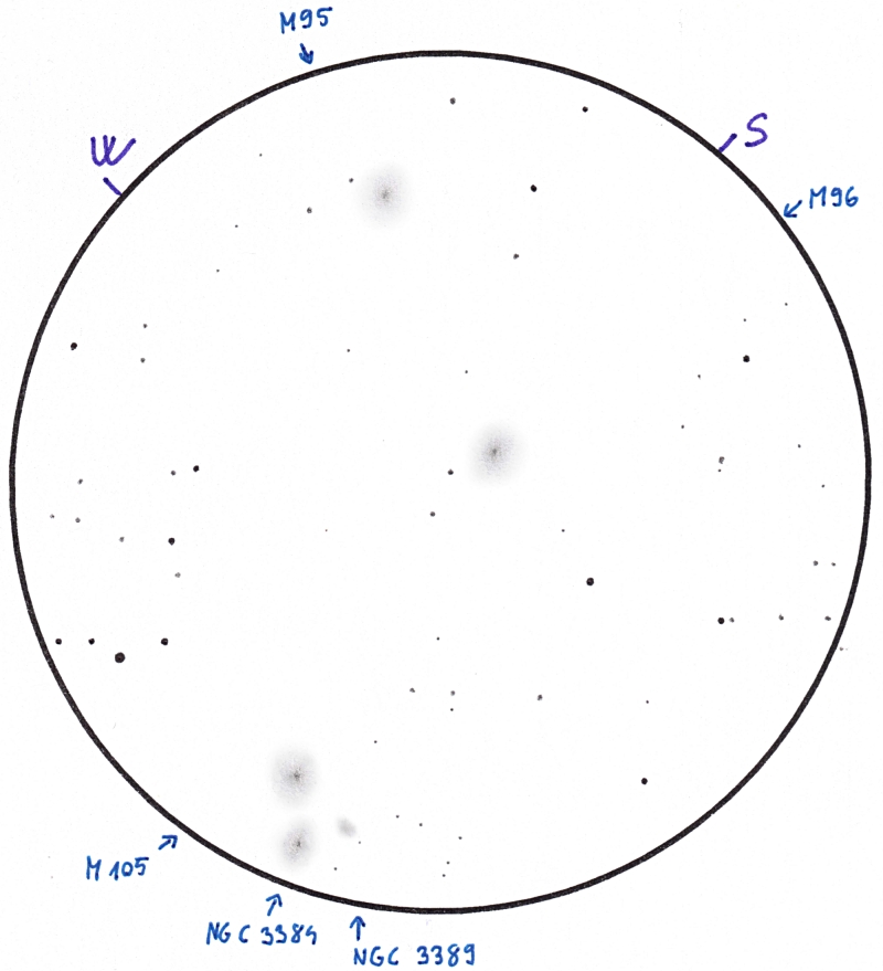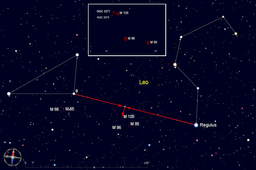 Az M95, M96 és M105 egy gyönyörű galaxistripletet alkot az Oroszlán hasánál. 9 és 10 magnitúdó közeli objektumok, 15 cm feletti átmérőjű távcsővel már igen kellemes célpontok.