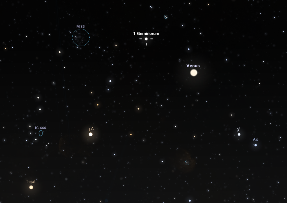 A hónap első napján, pénteken hajnali 3:30-kor a keleti horizont felett 10 fokkal ékeskedik majd az égbolt egyik legfényesebb objektumaként a Vénusz. Nem lesz nehéz tehát megtalálni az Ikrek csillagképben, és arra fordítani távcsövünket, avagy binokulárunkat, hogy észrevehessük az együttállás másik két résztvevőjét: a Vénusztól 1,4 fokra balra fentebb látható, 4,2 magnitúdós látszó fényességű 1 Gem csillagot és az attól még tovább 1,6 fokkal balra található M35-ös számú nyílthalmazt.