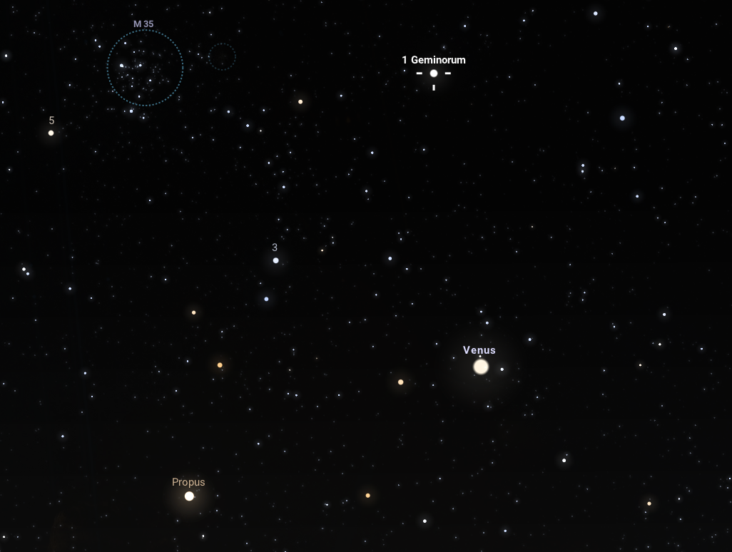 Augusztus 2. A Vénusz, az M35, az 1 Gem és a Propus négyszöge