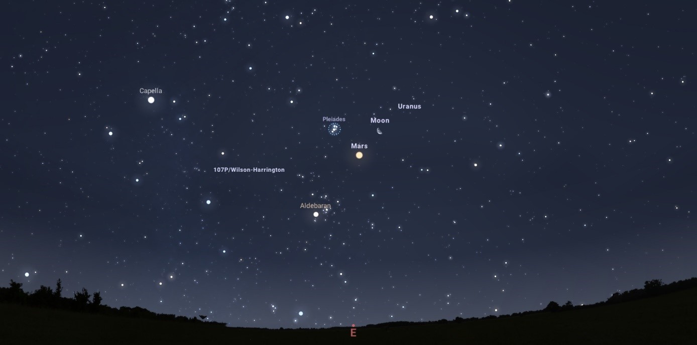 Hajnali 1 körül kezd kiteljesedni a dolog, és innen egészen napkeltéig megtekinthető is lesz, amint egyrészt, az Aldebaran, a Mars és a Hold egy vonalban látszik, másrészt, a Hold–Mars–Fiastyúk egyenlő szárú háromszöget alkot. Teszik mindezt nagyjából 30 fok magasan, vagyis könnyen megfigyelhető eseménnyel van dolgunk!