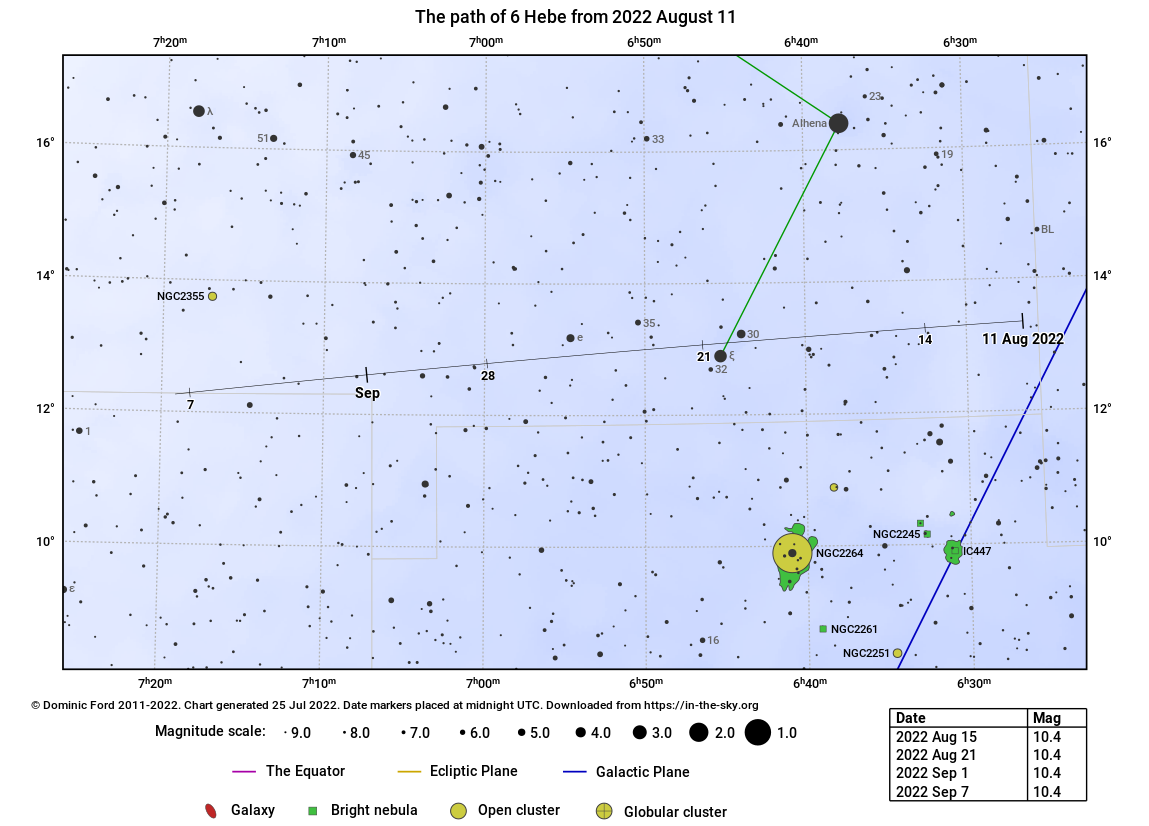 A 3, illetve 2,1 magnitúdós csillagok között elhúzó kisbolygó a Gemini (Ikrek) csillagképben ismét lehetővé teszi, hogy teljesen kezdők is sikeresen megfigyeljenek egy kisbolygót. 10 centiméteres vagy nagyobb teleszkóppal, közepesen fényszennyezett égről jó esélyünk van a sikerre.