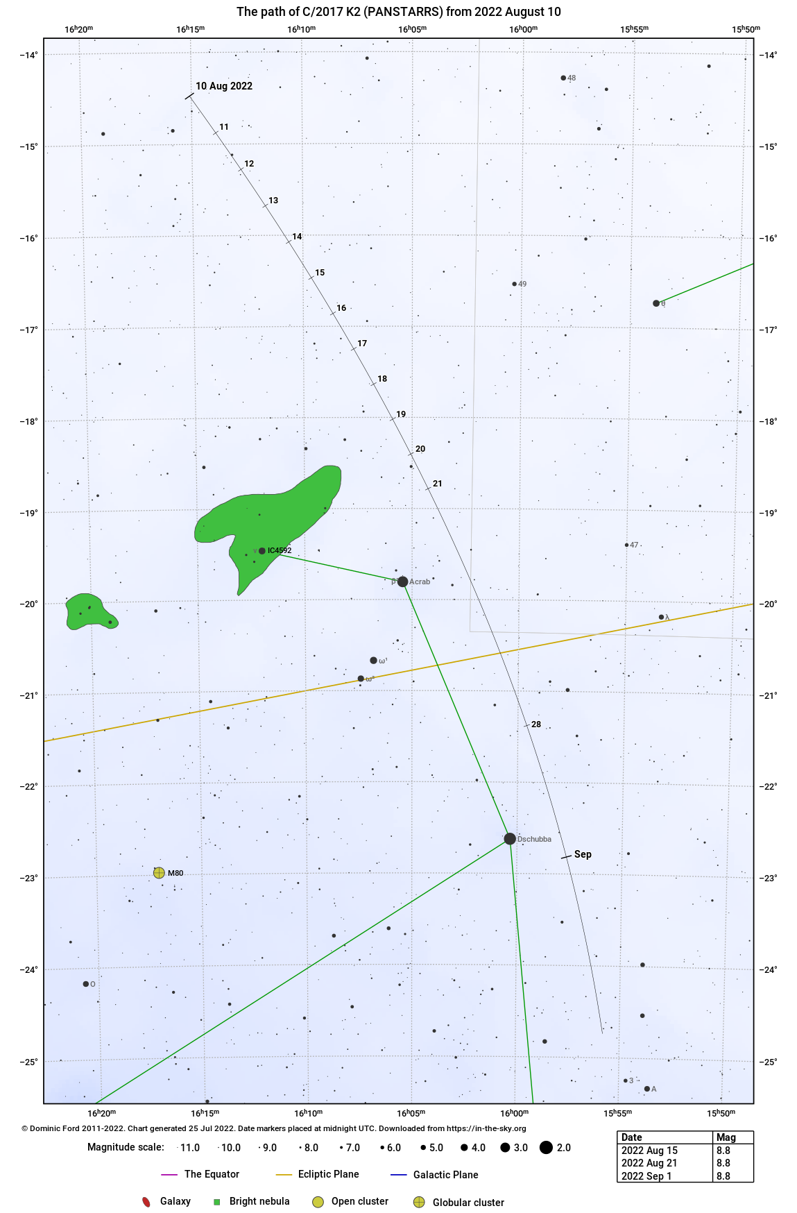A béta Scorpii (Acrab) egy fényes, 2,62 magnitúdós csillag a Skorpió csillagképben, vagyis az üstökös megtalálása ismét nagyon könnyűvé válik 21-én (emlékezzünk, nemrég az M10 mellett suhant el a K2).
