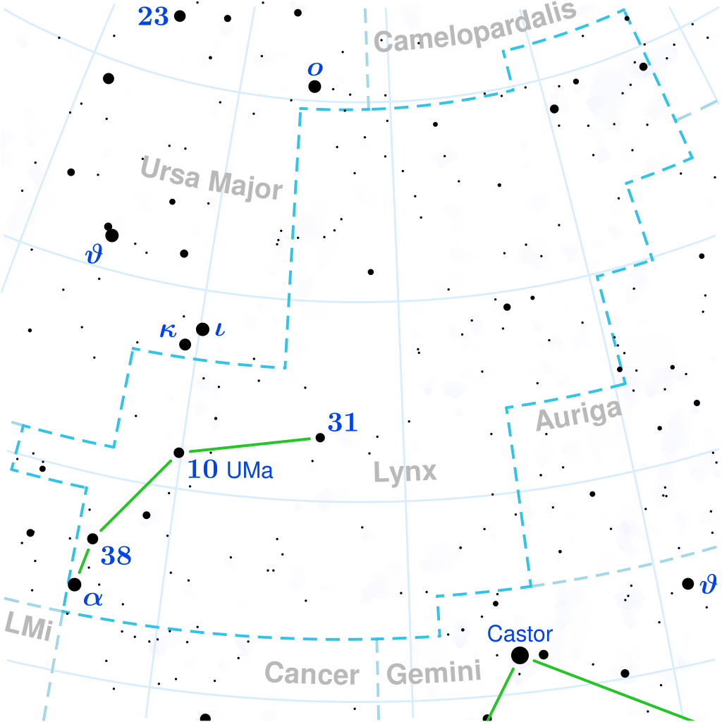 - 38 Lyncis: több csillagból álló rendszer, amely kb. 125 fényévre van a Naptól. Közepes méretű távcsővel nézve két komponens látható: egy fényesebb, 3,9 magnitúdós kék-fehér csillag és egy halványabb, 6,1 magnitúdós csillag. A halványabb komponens maga is egy szoros kettőscsillag.