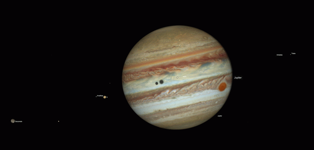 A Jupiter négy legnagyobb holdja a négy Galilei hold, melyeket már Galileo Galilei is észrevett távcsövével. Ezek, ha pontosan Földünk felé billennek, igencsak megható kölcsönös fedéseket és fogyatkozásokat produkálnak, ami ritkaság, és csak hatévente fordul elő egy pár hónapos ablakban.