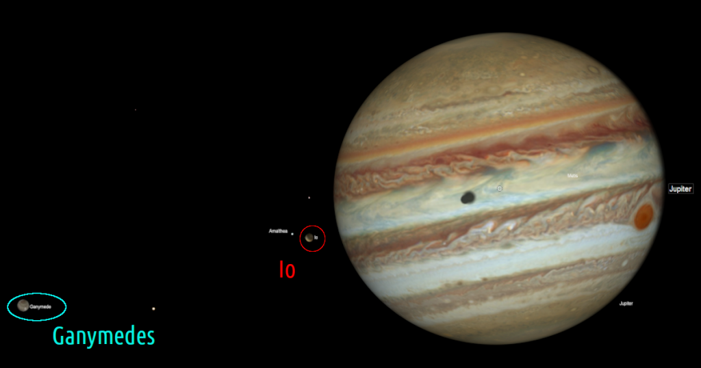 Az Io-árnyék belépésének megpillantása nem könnyű feladat, a remegő bolygó 4 fokkal lesz ekkor a horizont fölött. Az Io, mint a legbelső Galilei-hold, a legrövidebb keringési idővel rendelkezik, és így a többi holdnál gyorsabban is mozog a bolygó körül. Így folyamatosan közeledik a Ganymedes sötétsége felé az árnyéka, hogy később egyesüljön vele.