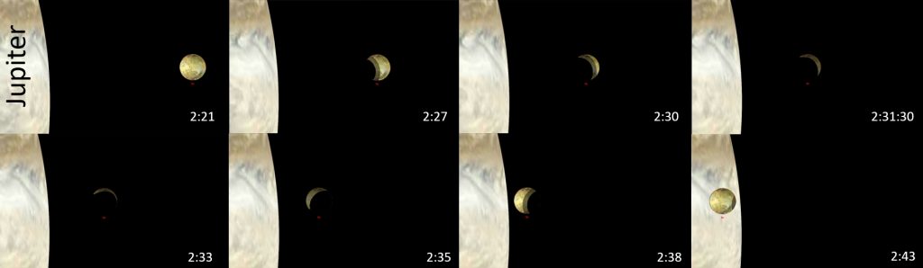 Azonban 2:40-kor, mikor még az árnyék sarka a holdon, az Io belép a Jupiter korongja elé. Kérdéses, de annál izgalmasabb, hogy ez fog-e egyáltalán, és hogyan fog látszani!