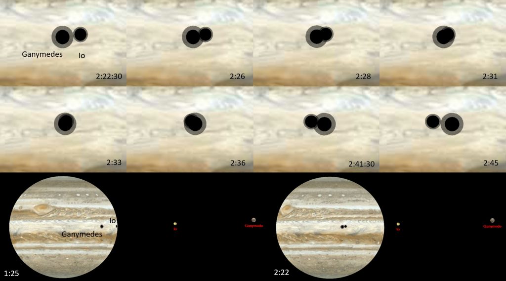Ezután a Ganymedes umbrája fokozatosan benyeli az Io-árnyékot, 2:28-kor már ovális egyesült árnyéknak látszanak.