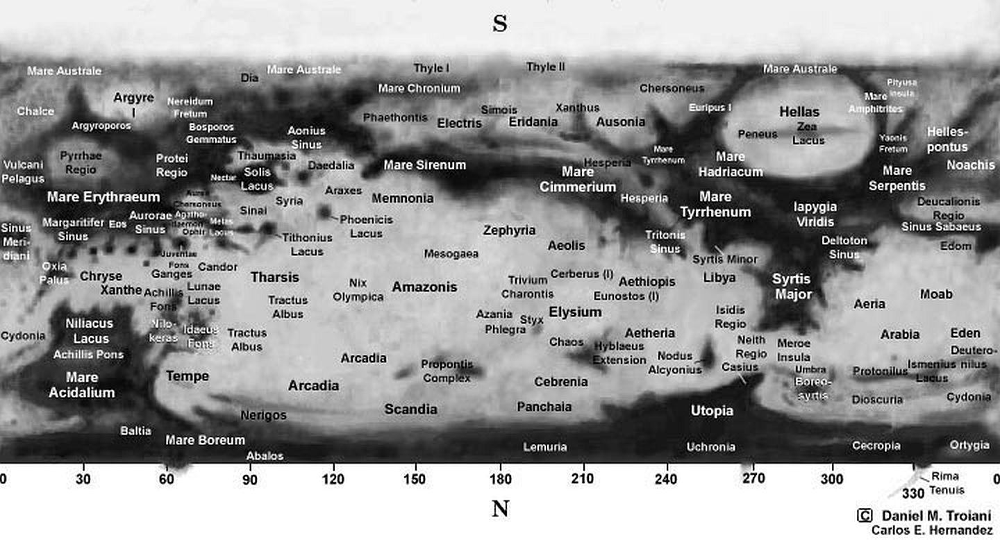 - A marsi tengerek közül a leglátványosabb az Indiai-félszigethez hasonlóan a sötét tengerből lenyúló Syrtis Major (Nagy Zátony), mely a bolygó legsötétebb és legfeltűnőbb alakzata. A Syrtis Major fölött a Hellas medencéje, ez a 2300 km átmérőjű és 7 km mély óriási becsapódásos medence világos ovális foltja látszik (l=290 fok).