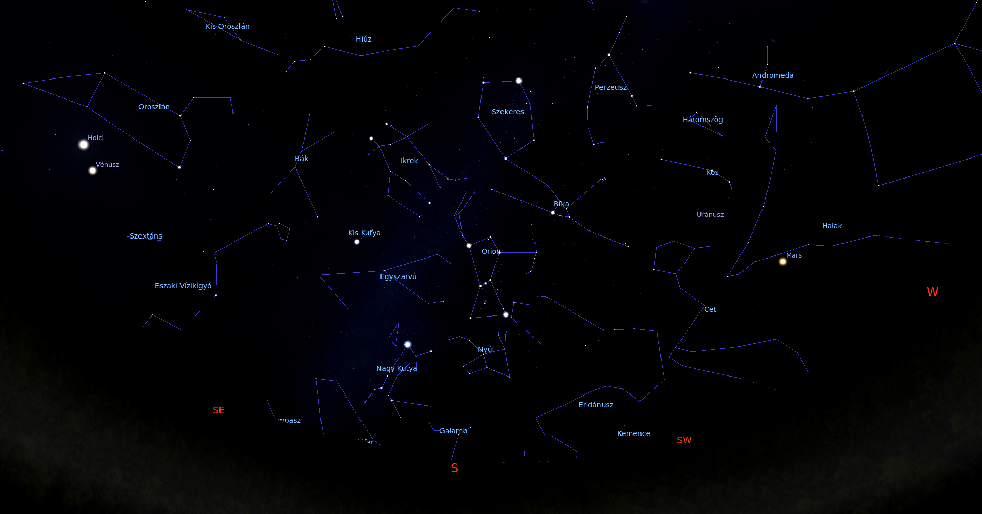 Hajnalban már a téli égbolt lenyűgöző csillagképei – a Téli Hatszög alkotói, például az Orion, a Fiastyúk, illetve a Hold és a Vénusz ékesíti a didergő fényáradatot.
