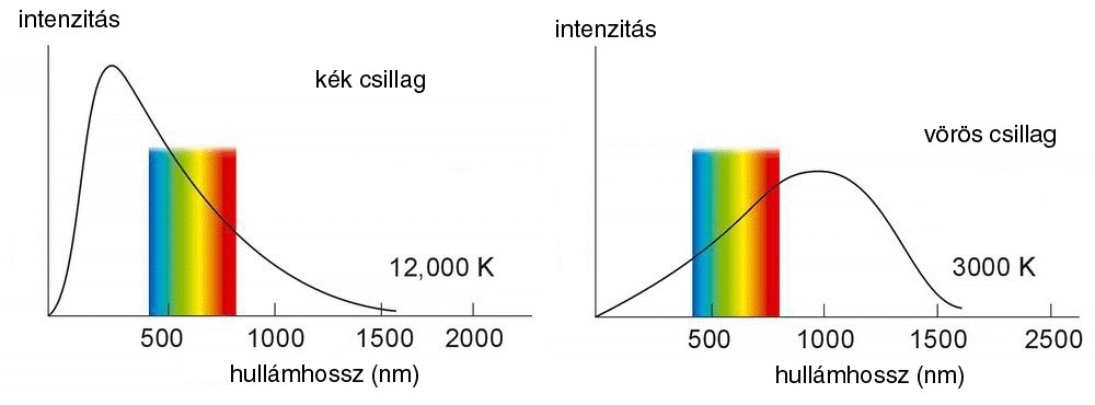 Alaposabban megvizsgálva a csillagokat, észrevehetjük, hogy különböző színekben ragyognak. A különböző színek oka a csillagoknak eltérő felszíni hőmérséklete. A hidegebb csillagok sugárzási intenzitásának maximuma a vörös szín felé, míg a forróbbaké a kék színhez esik.