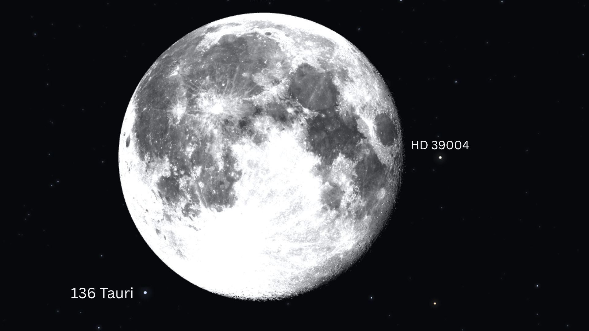 A telihold közvetlen közelében viszont ez teljesen lehetetlen. Egy távcső segítségével azonban egy felettébb érdekes jelenséget figyelhetünk meg 6-án, a kora hajnali óráiban. A HD 39004 okkultációja után a Hold bekerül az imént említett két csillag közé. Ez egy kisebb nagyítású távcső látómezejébe épp belefér, csak éppen a Hold túlragyogja a csillagokat. Egyesével, nagyobb nagyítással megfigyelhetjük a két csillagot, és gyönyörű párosokat alkotnak a Holdunkkal. A halványabb csillagtól távolodva égi kísérőnk megközelíti a 136 Taurit, majd Budapestről nézve a minimális szögtávolságuk mindössze 33” lesz, ami egy fok százkilencede. A Hold látszó átmérője a jelenségkor (mivel nem sokkal földközelpont, azaz perigeum után leszünk) majdnem 34’, tehát szinte pontosan 60-szor akkora, mint a szögtávolság közte és a 136 Tauri között. A fővárostól északkeletre a Hold el is takarja a csillagot. Igaz, csak épp érinti a holdkorong peremét, és amögé alig néhány perc erejéig bújik be.