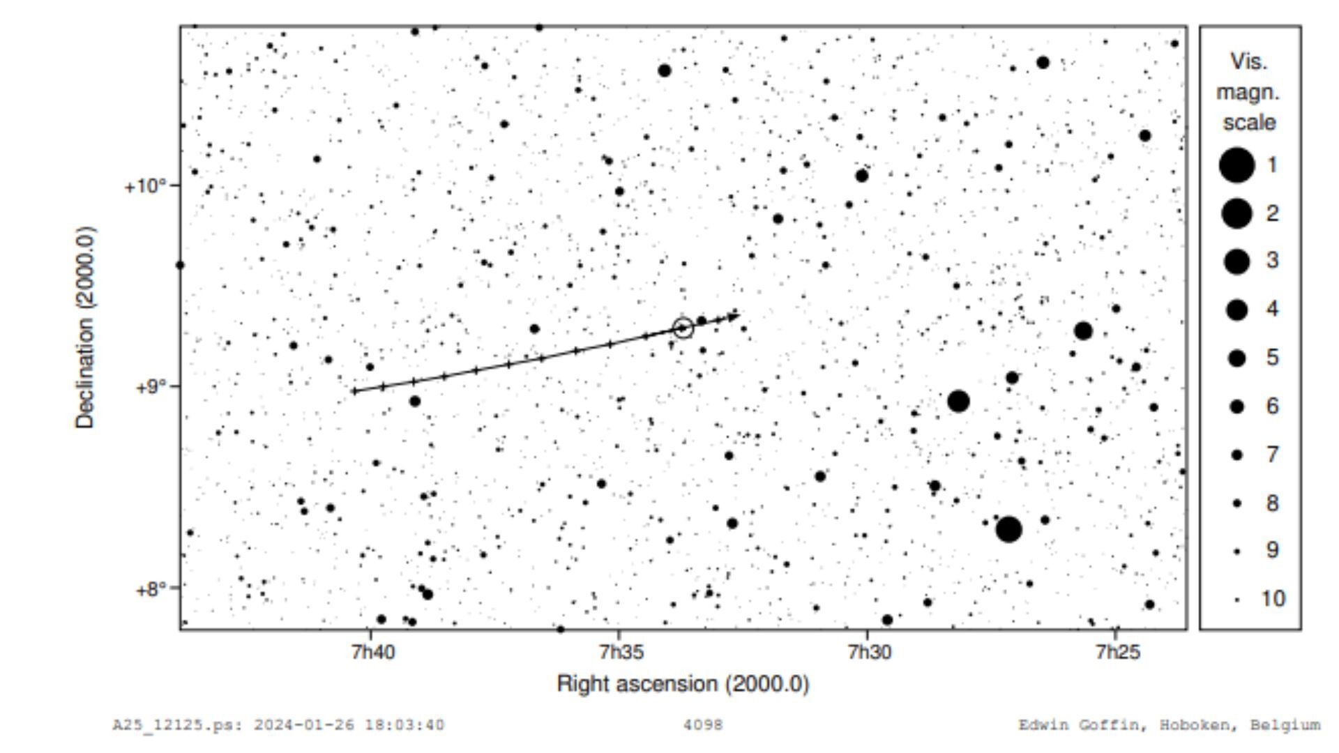 A TYC 0765-00273-1 egy 9,9 magnitúdós csillag a Kis Kutya csillagképben. A halvány fényű csillagot csak távcsőben lehet megfigyelni. A jelenségben részt vevő kisbolygó még a csillagnál is halványabb, mindössze 14,3 magnitúdós, mely már-már láthatatlan egy kisebb méretű műszerben.