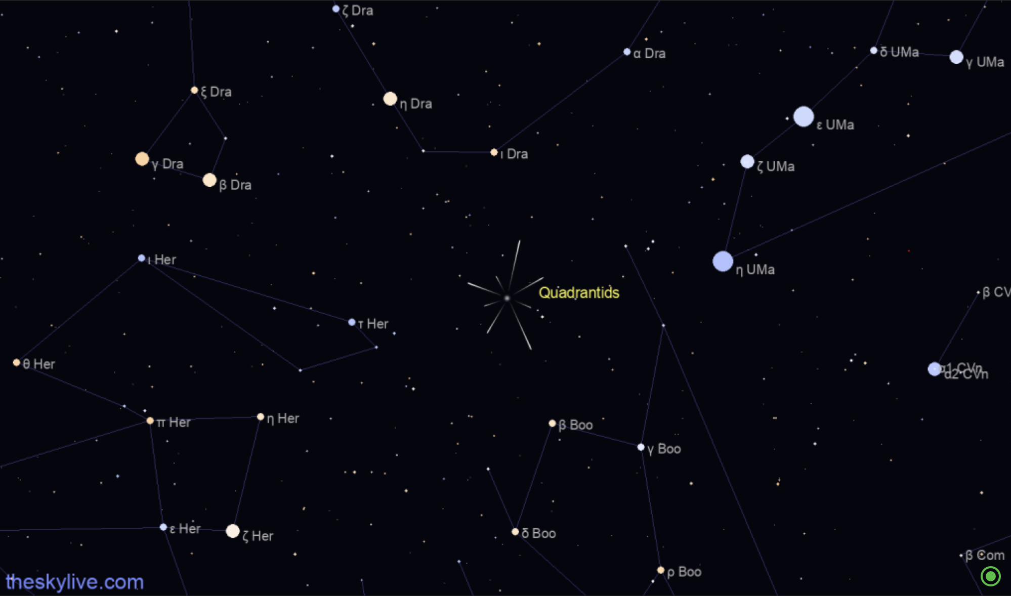 Az évkezdet legfontosabb és leglátványosabb, szabad szemmel is látható csillagászati eseménye a Quadrantidák meteorraj érkezése, amely minden évben január első napjaiban lászik egünkön. A raj december 28-tól január 12-ig aktív, ebben az időszakban érdemes tekintetünket egy-egy hullócsillag reményében az égboltra vetni. A csúcs január 3-án az éjszakai órákban várható, a raj radiánsa is a késő éjjeli órákban emelkedik a horizont fölé. A megfigyelésre legalkalmasabbak a január 4-i hajnali órák – bár a hajnali fél egykor 68 fokos magasságban delelő telihold sajnos alaposan megnehezíti majd a megfigyelést. A Quadrantidák ez alkalommal az előrejelzések szerint óránként körülbelül 80 hullócsillagot fog az északi égboltra rajzolni. Ezzel felveszi a versenyt az augusztusi Perseidákkal és a decemberi Geminidákkal is – a raj mégsem kap annyi figyelmet, mint hasonlóan aktív társai. Pedig különlegességekből nincs hiány.