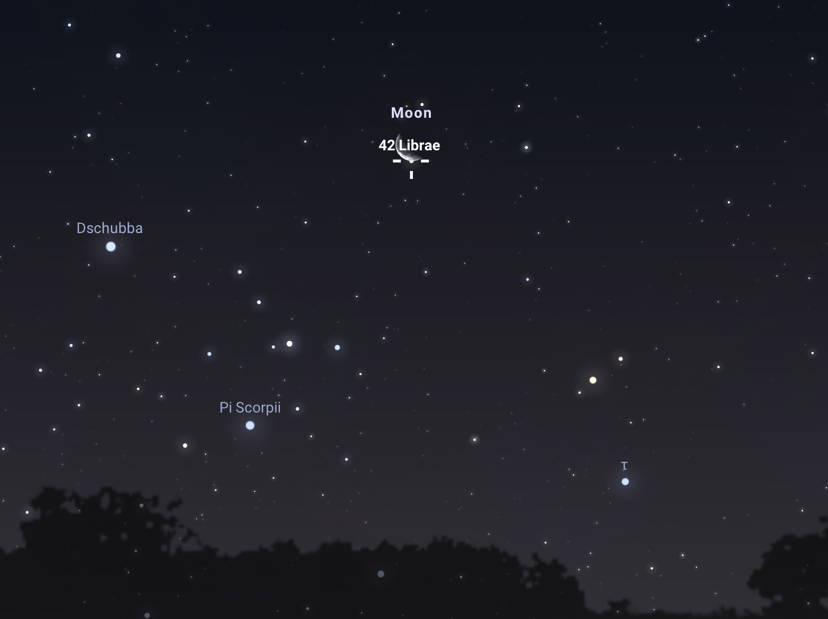 Az okkultációk kedvelőinek sem kell sokat várni a hónap első eseményére, ezen a hajnalon 03:26-kor Holdunk az 5,1 magnitúdós 42 Lib csillagot fedi el. A belépésre a 38%-os holdsarló világos peremén, 8 fokos horizont feletti magasságban, a kilépésre pedig 04:28-kor, 13 fokos magasságban kerül majd sor – a jelenség kisebb műszerekkel is jól megfigyelhető lesz.