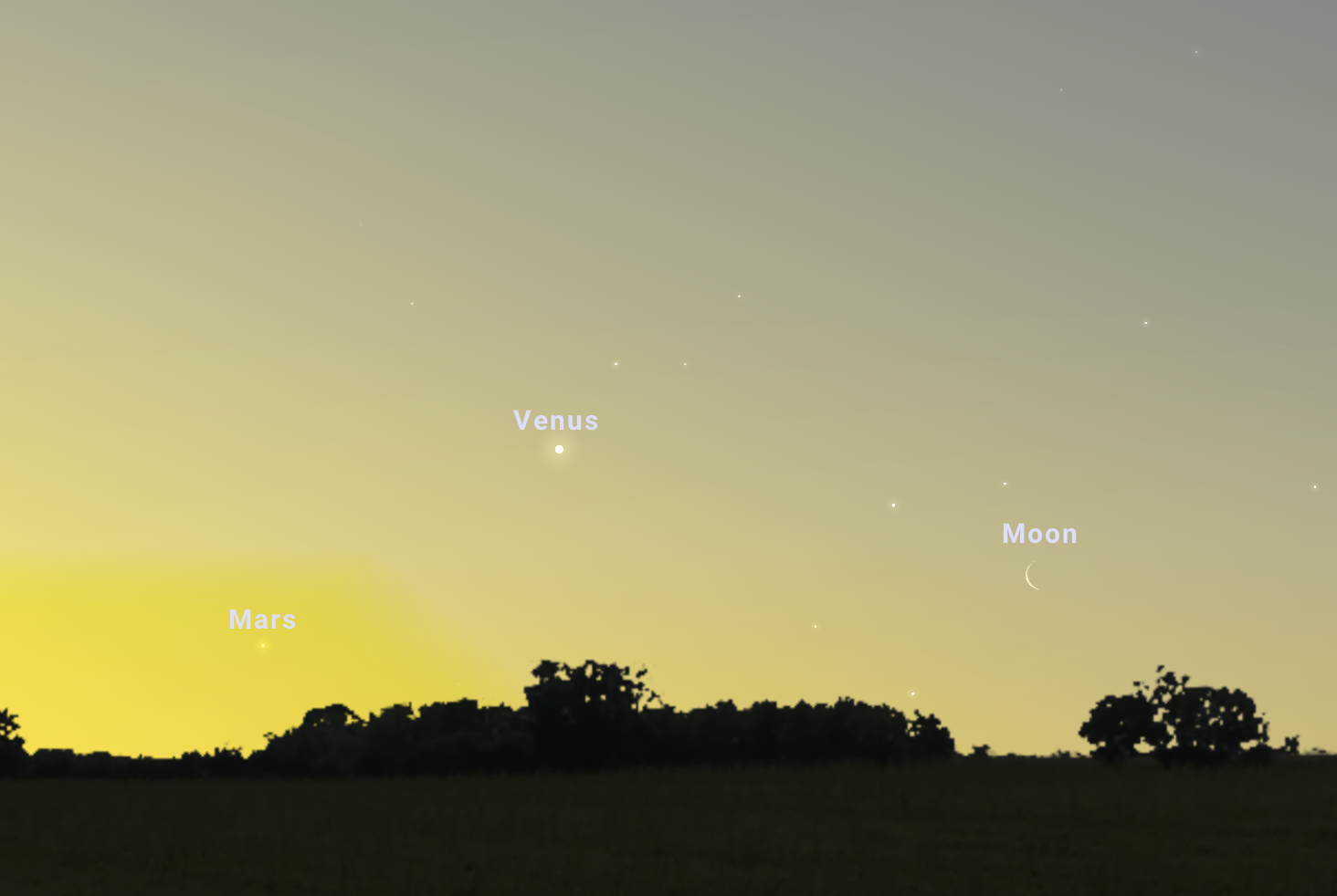Ezen a kora reggelen, a polgári szürkület kezdetén a még mindig -3,9 magnitúdóval fénylő Hajnalcsillag, a már csak 10%-os megvilágítottságú, vékony holdsarló és az 1,3 magnitúdós, sápadtan pislákoló Mars áll majd együtt a keleti, délkeleti horizont felett.