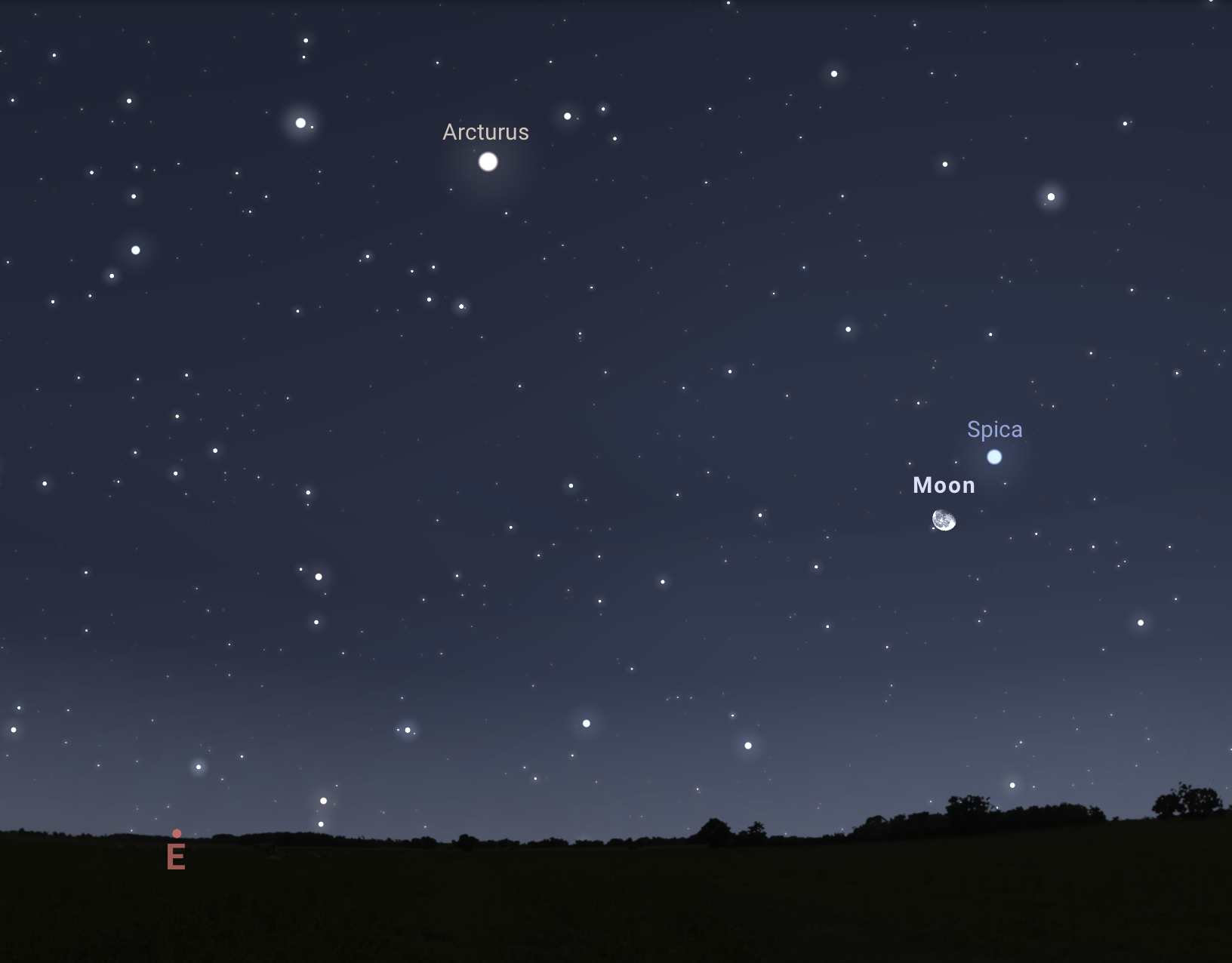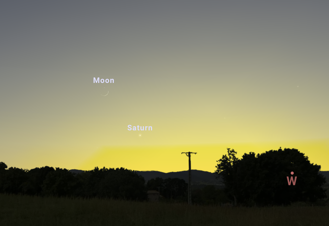 17:30-kor, a polgári szürkület végén pillanthatjuk meg a mindössze 4%-os megvilágítottságú kísérőnket a nyugati horizont felett, tőle nyolc fokra a látóhatár felé pedig kereshetjük az 1 magnitúdóval fénylő Szaturnuszt is. A megfigyeléshez binokulárt ajánlunk.
