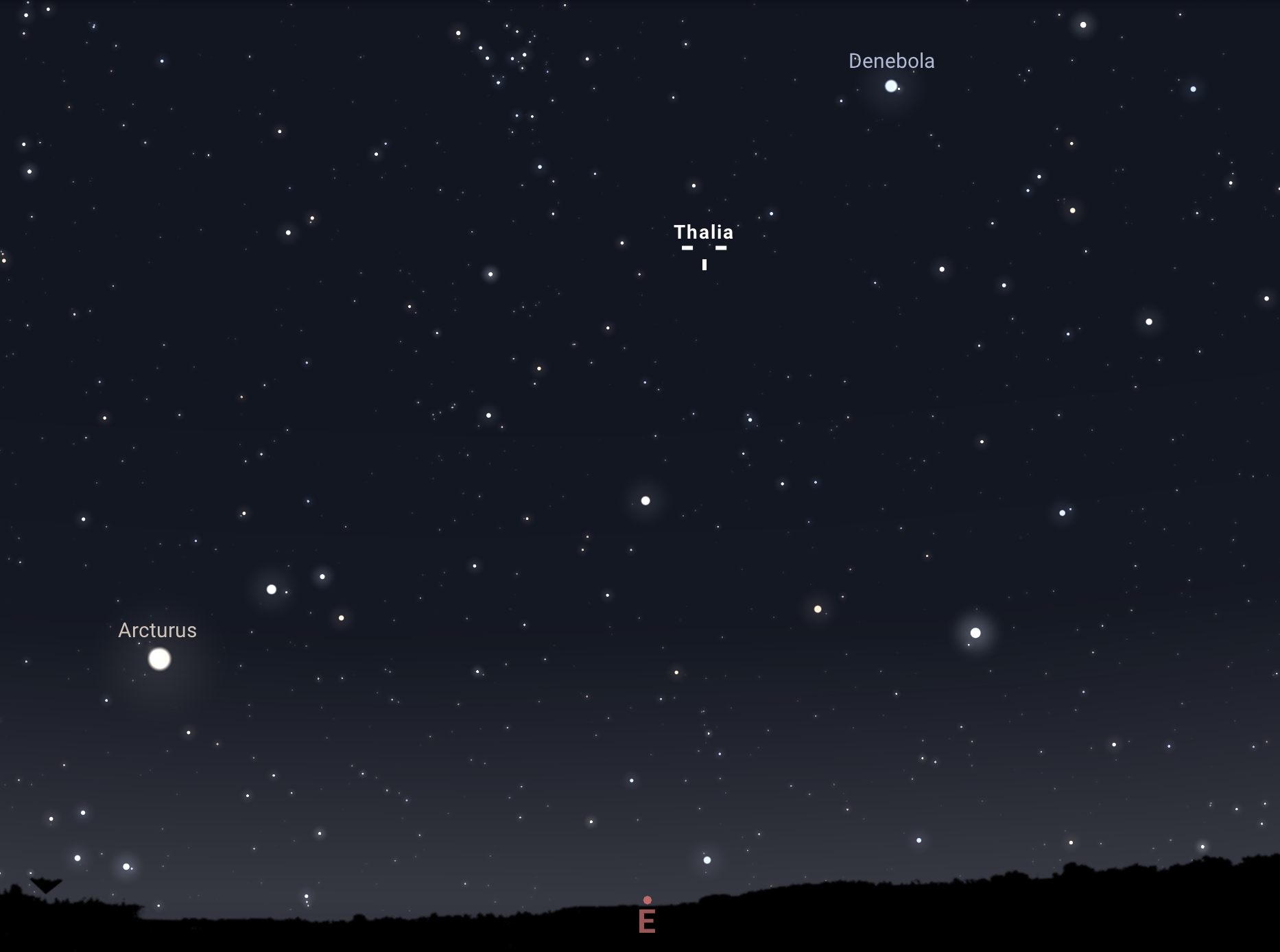 Ezen az éjszakán oppozícióba kerül az 1852-ben felfedezett, a komédia és a színház istennőjéről elnevezett (23) Thalia kisbolygó. Az égitest a Mars és a Jupiter között húzódó fő aszteroidaövben kering, 9,1 és 13,2 magnitúdó között változó fényességével pedig nem tartozik a könnyen észlelhető objektumok közé. A február közepi éjszakákon, földközelsége idején viszont valamivel 10 magnitúdó alatti fényességet produkál majd, érdemes hát megpróbálnunk felkeresni a Bereniké Haja, az Oroszlán és a Szűz csillagképek határán.