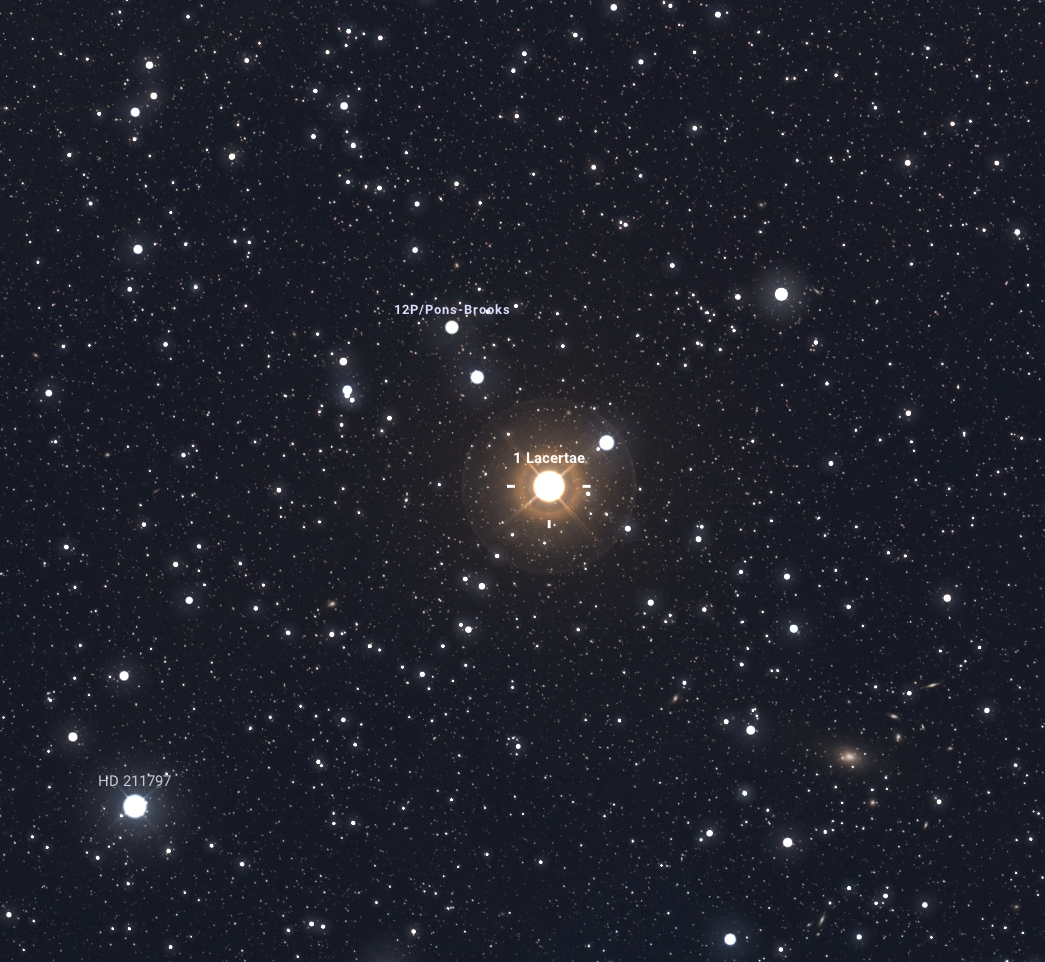 Egyelőre még távol van attól, hogy „fényes”-nek nevezzük, de február 13-án hajnali 05:00 órakor szoros együttállásban lesz a 4,1 magnitúdós, tehát viszonylag fényes 1 Lac csillaggal – ez jó alkalom, hogy „early bird”-ként észleljük a várhatóan 8,6 magnitúdó körüli fényességű üstököst.