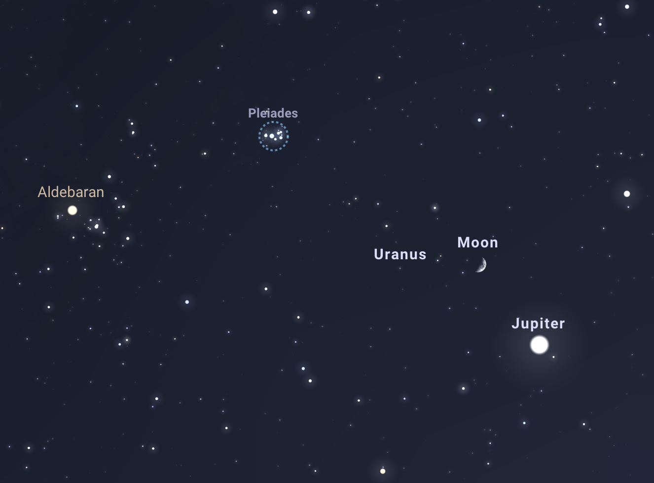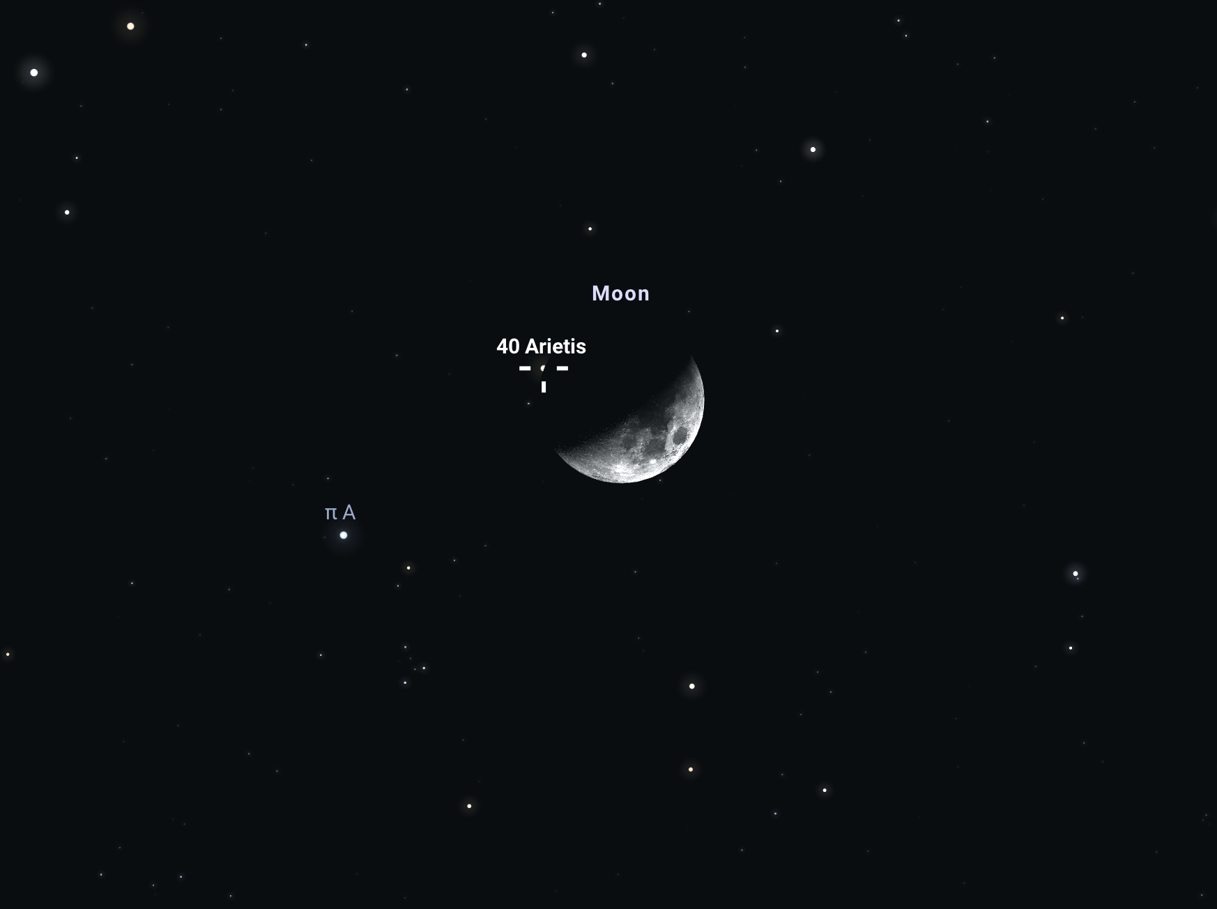 Megint a Hold viszi a showt, ezen az estén 18:15-kor pazarnak ígérkező együttállásba kerül a Jupiterrel és az Uránusszal, az előbbitől 6, az utóbbitól 5 fok távolságban. Kísérőnk a két bolygó között „függve”, mintegy mellékesen elfedi előbb az 5,9 magnitúdós 40 Ari-t (belépés 19:27-kor a sötét oldalon, kilépés 20:23-kor a világos peremen), majd a 7,9 magnitúdós HD 17531 csillagot (belépés 20:11-kor az északi pólusnál, kilépés 21:00-kor).