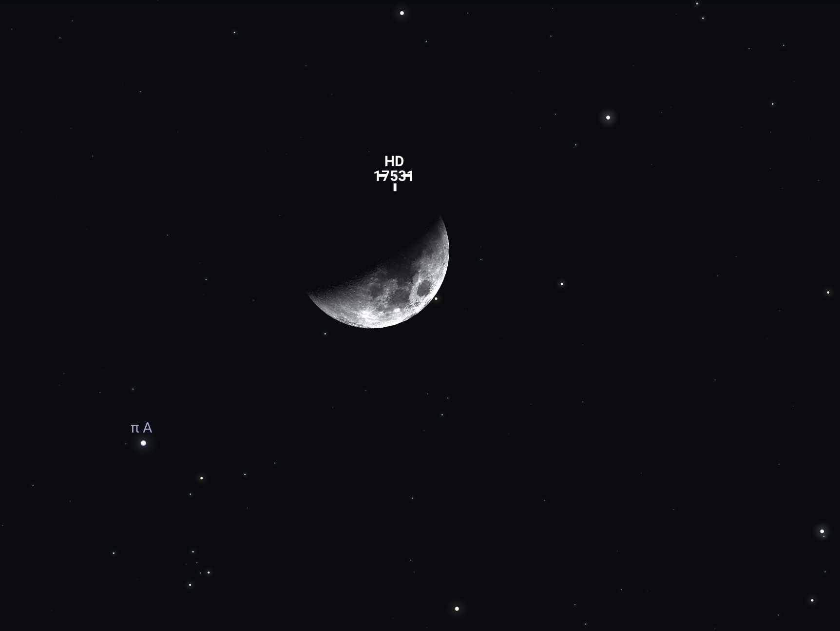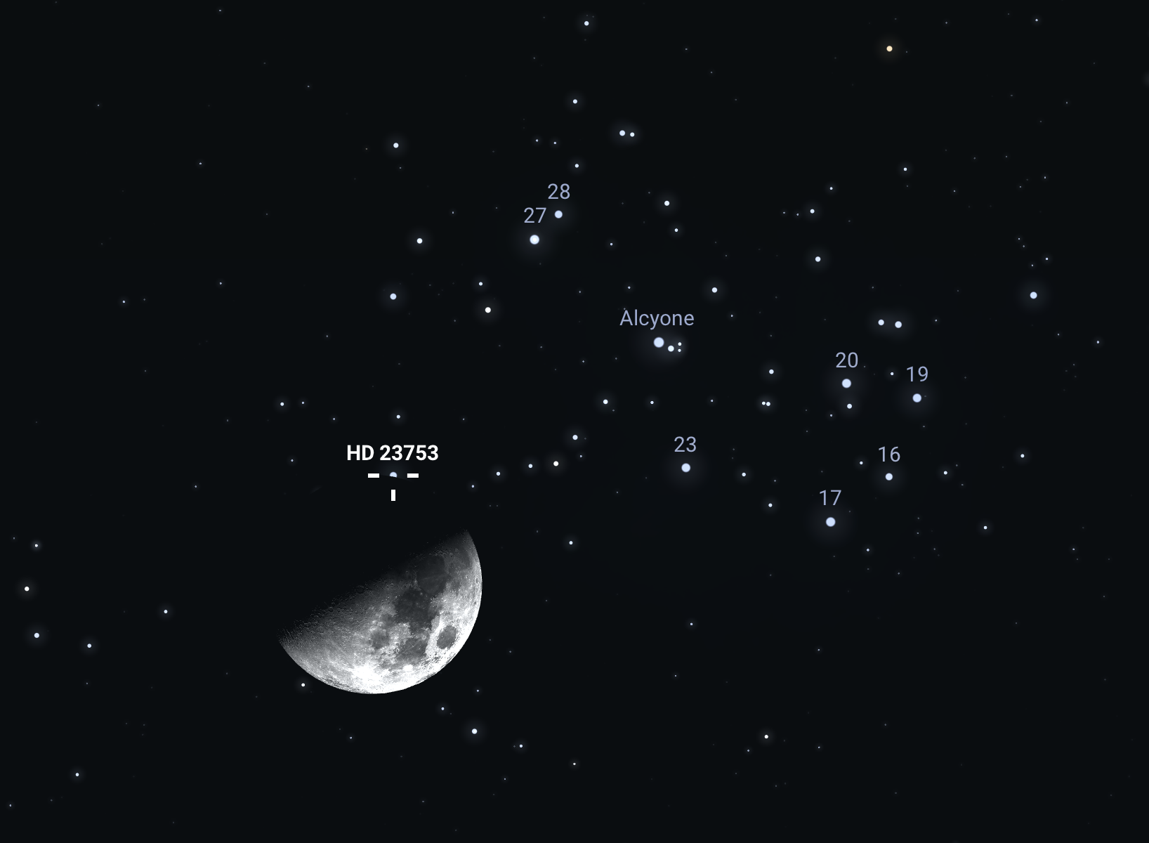 Ezek közül a leglátványosabb az 5,7 magnitúdós HD 23753 halmaztag fedése lesz, a csillag 22:14-kor lép majd be a Hold sötét oldalán, kilépésére pedig 23:01-kor kerül sor a fényes peremnél.